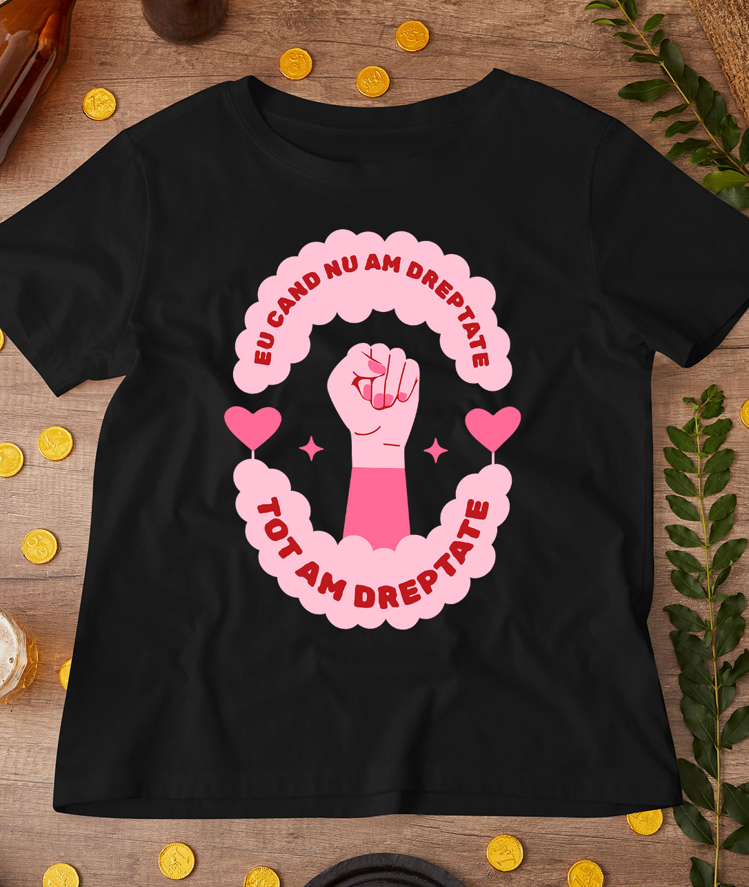 Tricou Femei cu Mana Umana Roz Mesaj Inspirational Sarcastic Femeile Au Mereu Dreptate, cu imprimeu pe Fata, 100% Bumbac, Negru, M