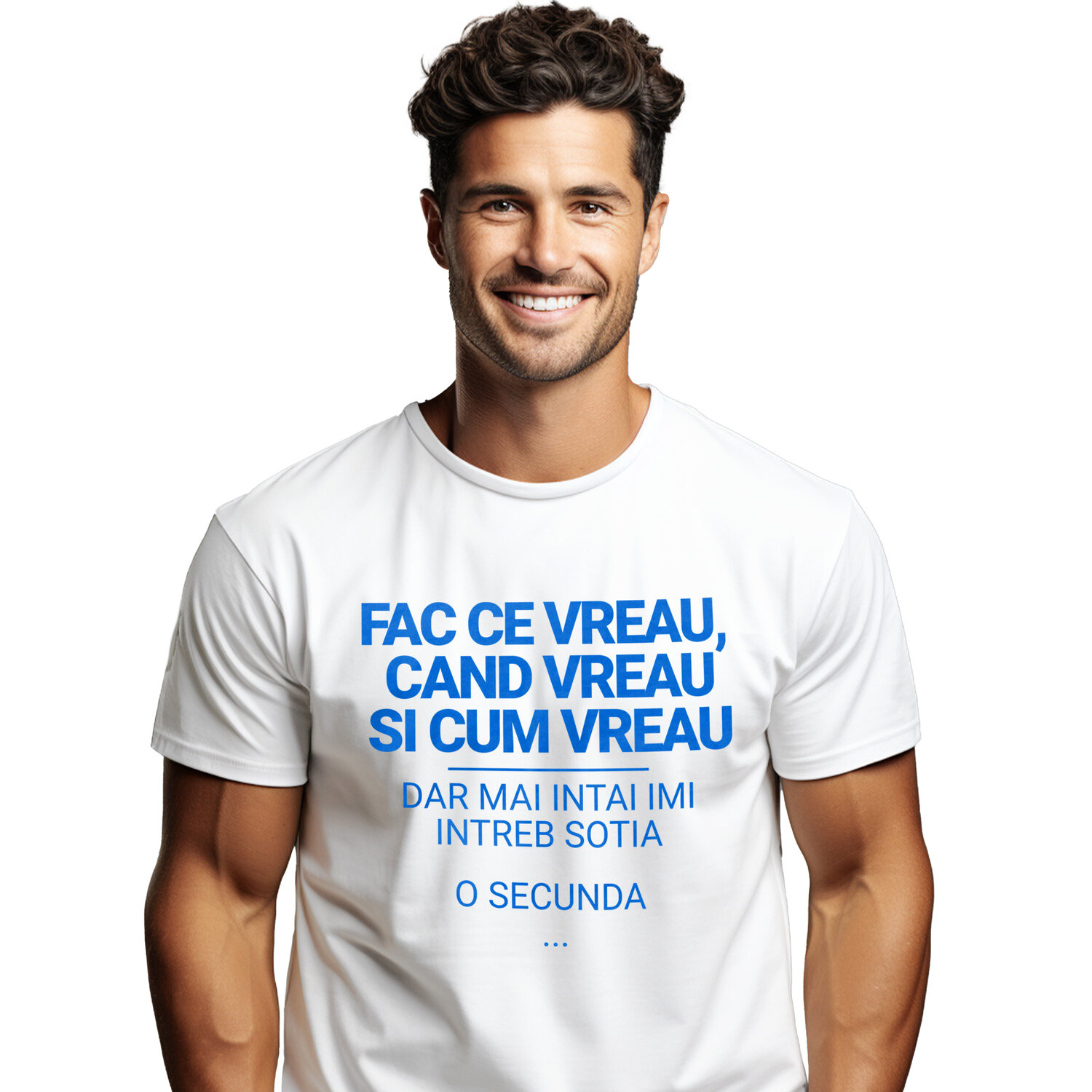 Tricou Barbati cu Mesaj Haios In Limba Romana Albastru, Sotia, Iubire, Casatorie cu imprimeu pe Fata, 100% Bumbac, Alb, XS