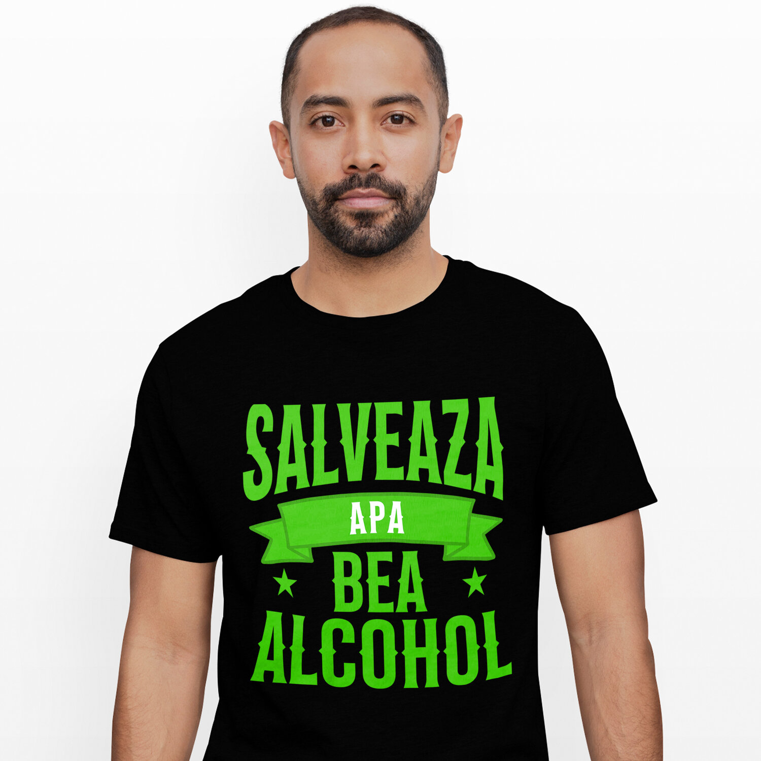 Tricou Barbati cu Mesaj In Limba romana Stele Si Alcohol Distractie Petrecere cu imprimeu pe Fata, 100% Bumbac, Negru, L