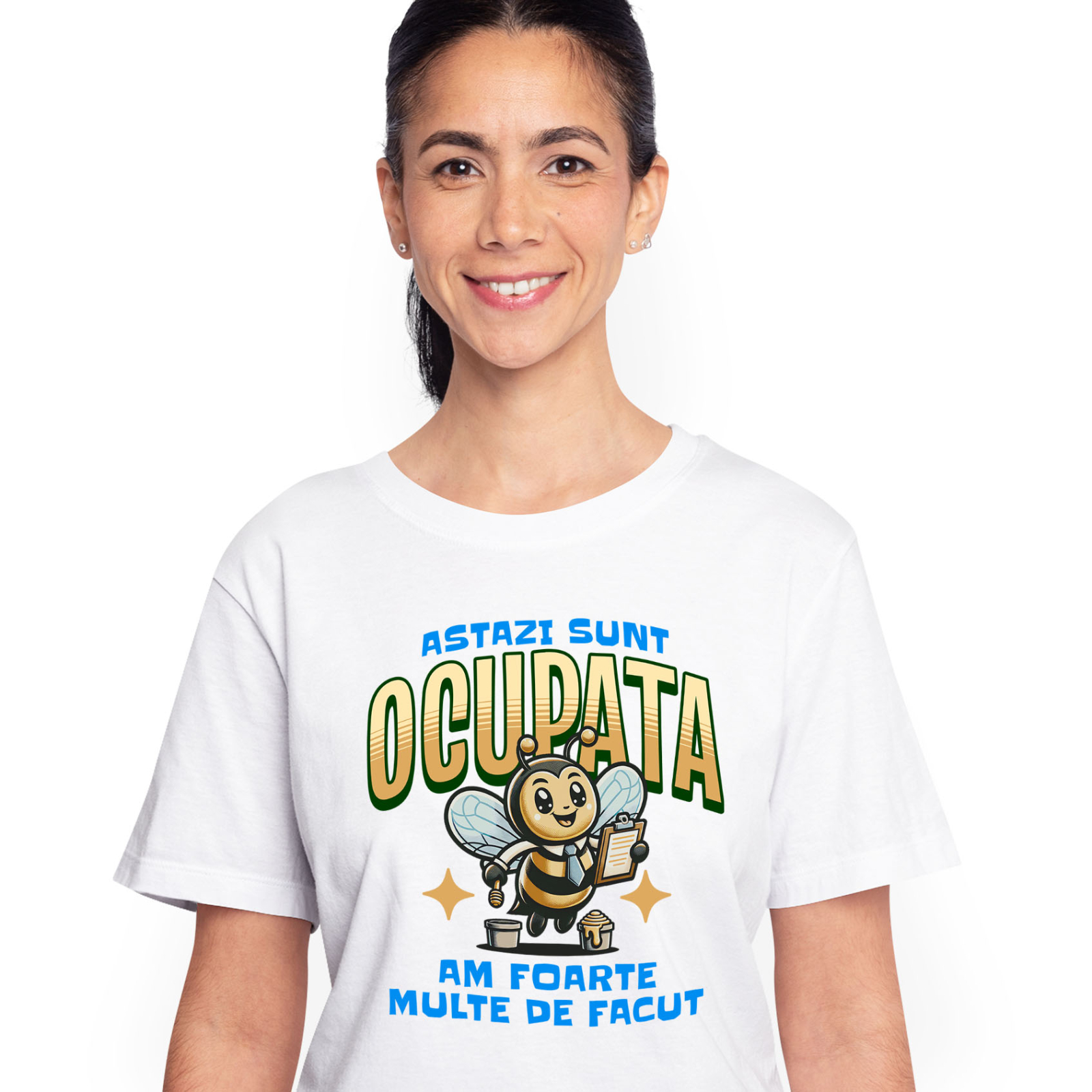 Tricou Femei cu Albina Cu Cravata Si Miere Ocupata Munca Birou Stres Extenuare cu imprimeu pe Fata, 100% Bumbac, Alb, S