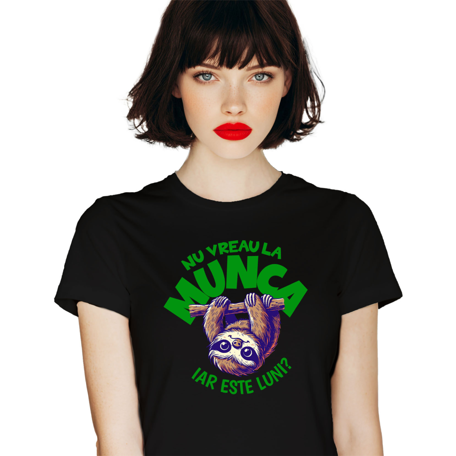 Tricou Femei cu Animal Lenes Atarnat De Creanga Munca luni, Extenuare, Adult cu imprimeu pe Fata, 100% Bumbac, Negru, L