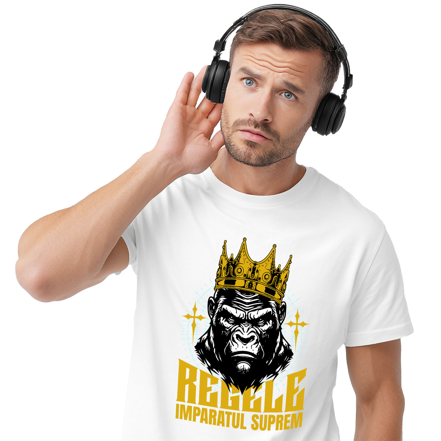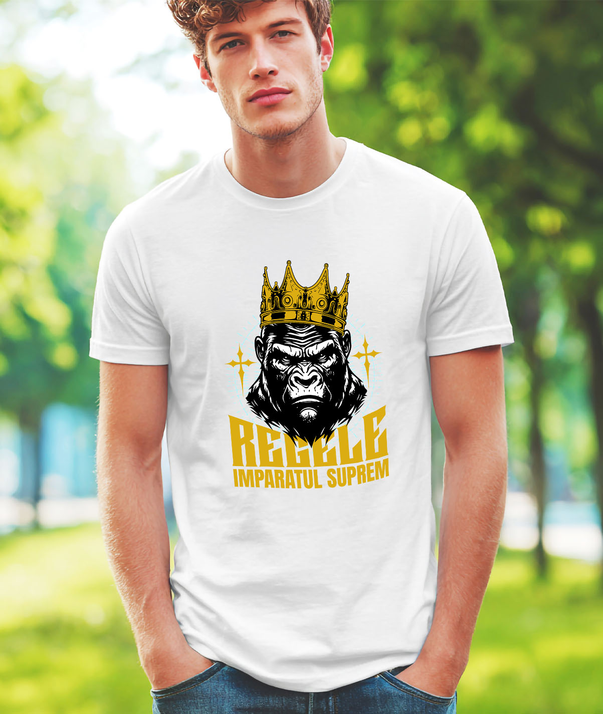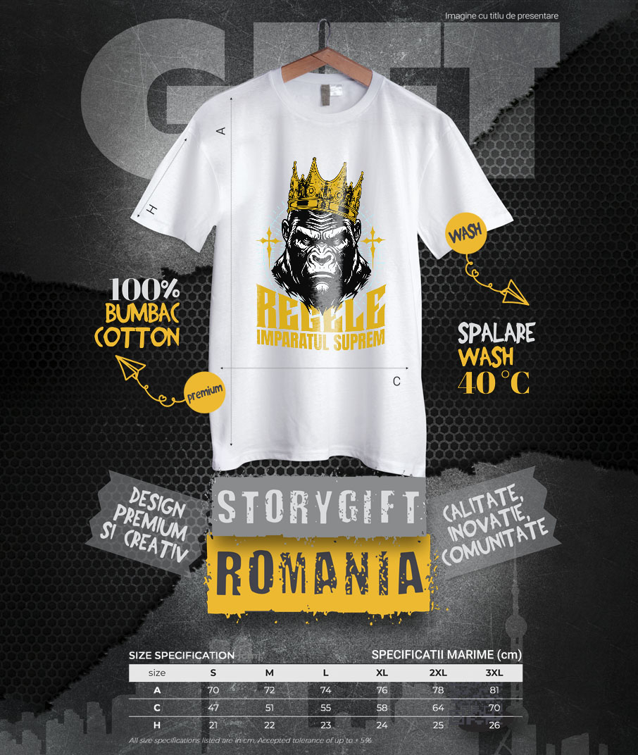 Tricou Barbati cu Gorila Cu Coroana Regala De Aur Regele Imparatul Suprem, Motivational Putere cu imprimeu pe Fata, 100% Bumbac, Alb, L