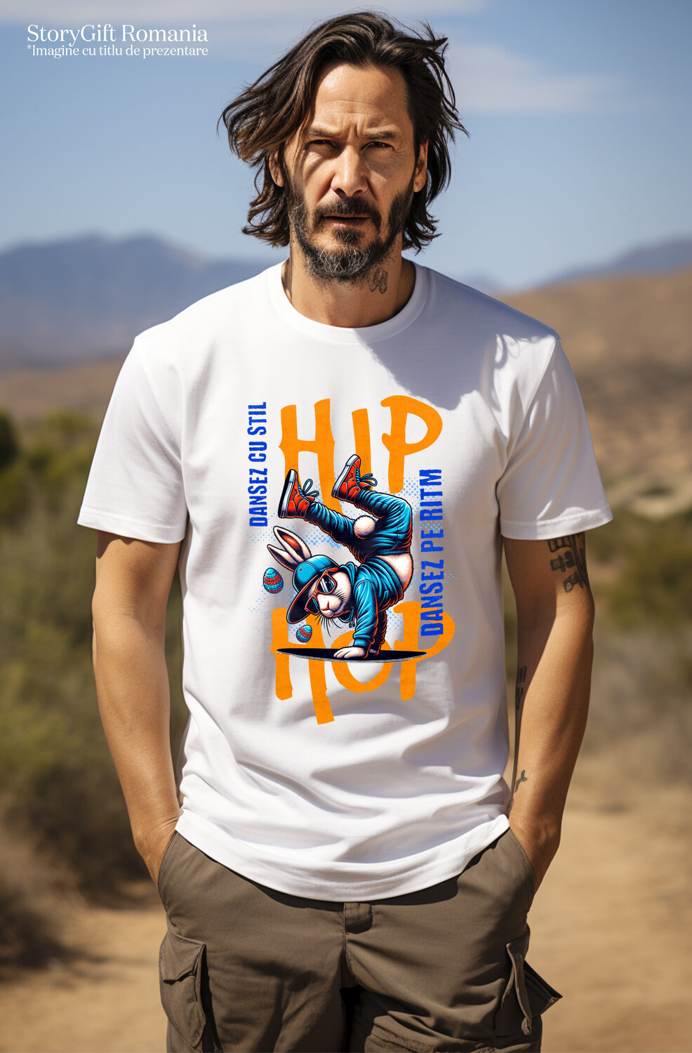 Tricou Barbati cu Iepure Pozitie Dans Breakdance, Stil Stradal, Copii Hip Hop, Distractie cu imprimeu pe Fata, 100% Bumbac, Alb, M