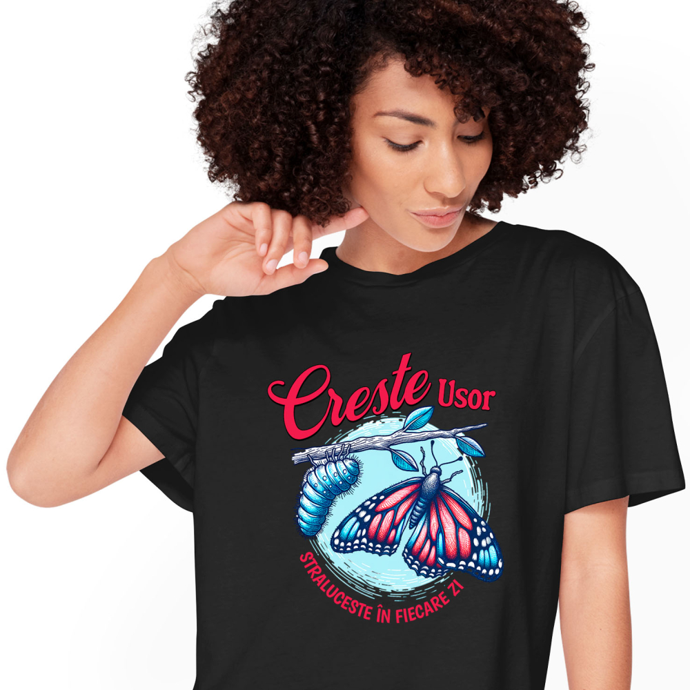 Tricou Femei cu Inspirational Fluture Colorat Pe Creanga Si Omida Evolutie cu imprimeu pe Fata, 100% Bumbac, Negru, XL