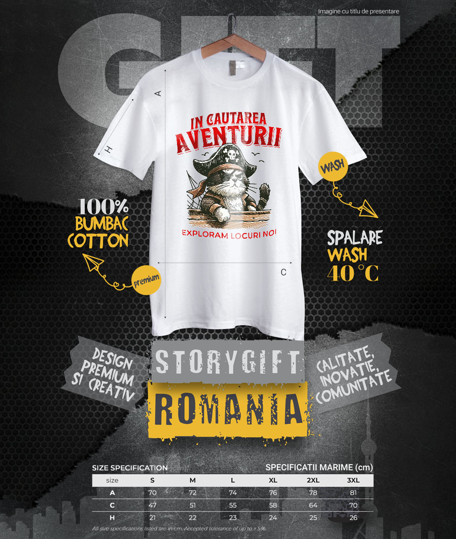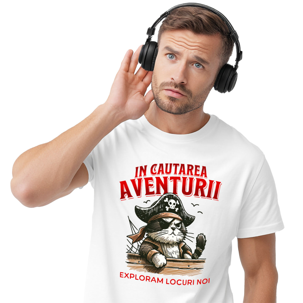 Tricou Barbati cu Pisica Cu Palarie De Pirat Si Corabie Exploram Locuri Noi Desene animate cu imprimeu pe Fata, 100% Bumbac, Alb, L