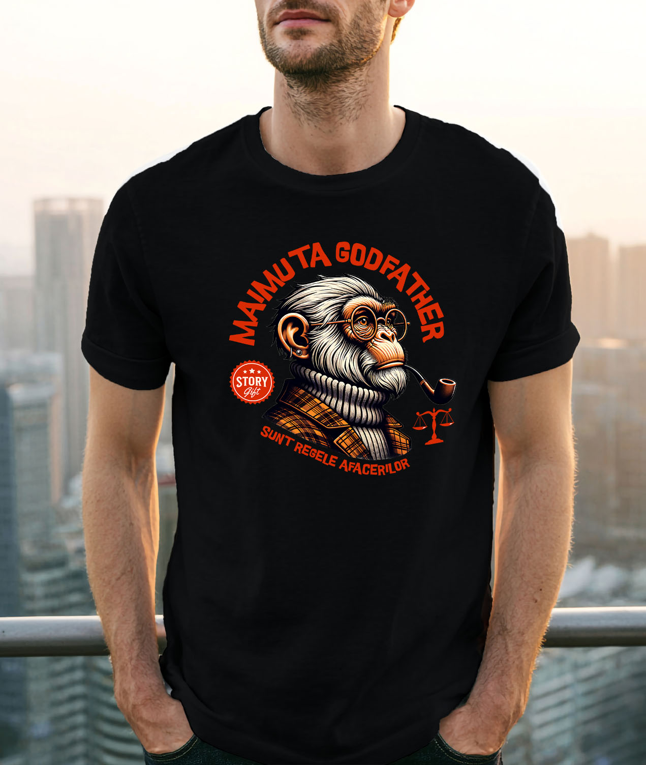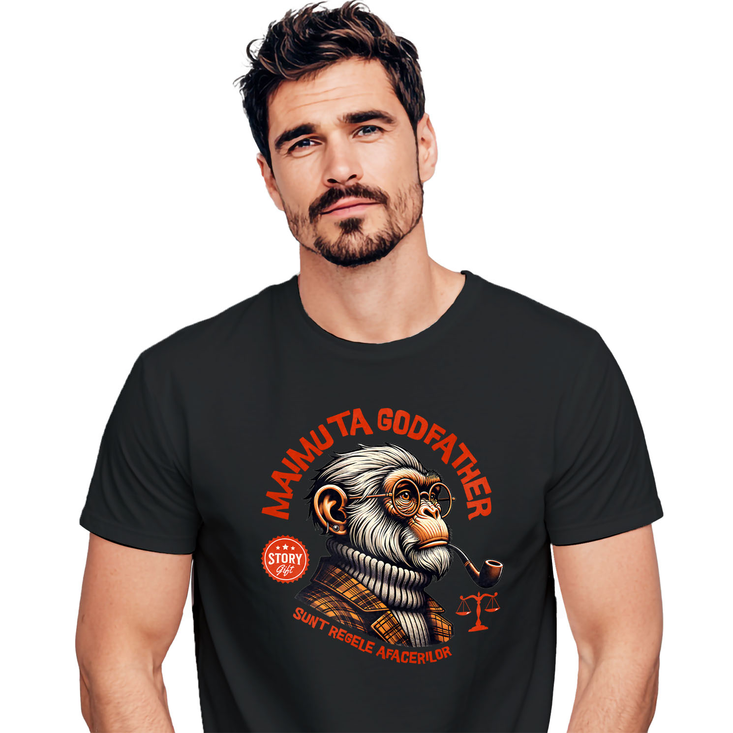 Tricou Barbati cu Portret Maimuta Cu Trabuc Si Ochelari De Vedere Fashion Balanta Afaceri, Filme cu imprimeu pe Fata, 100% Bumbac, Negru, L