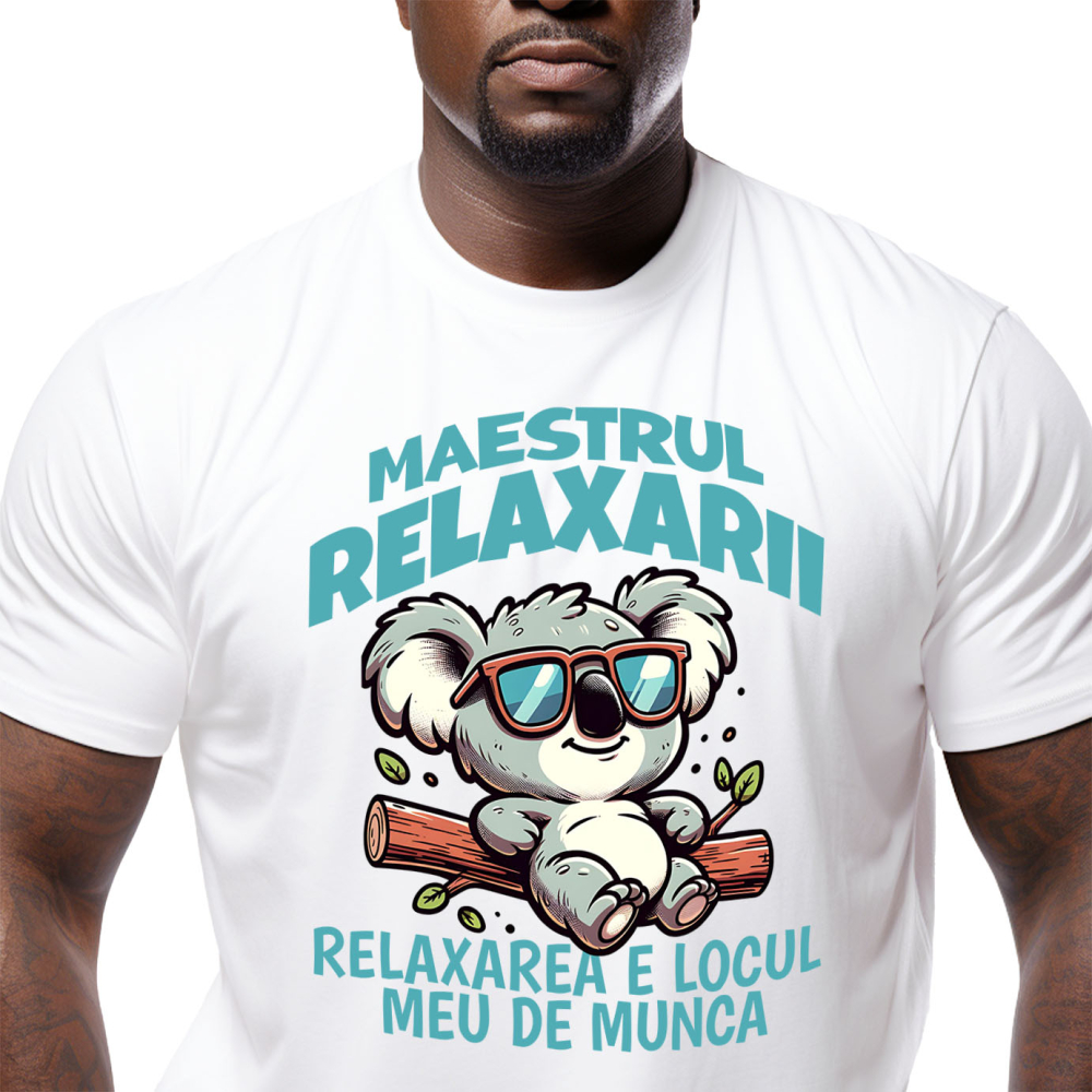 Tricou Barbati cu Urs Koala Haios Cu Ochelariii De Soare Pe Trunchi, Relaxare, Vacanta cu imprimeu pe Fata, 100% Bumbac, Alb, XS
