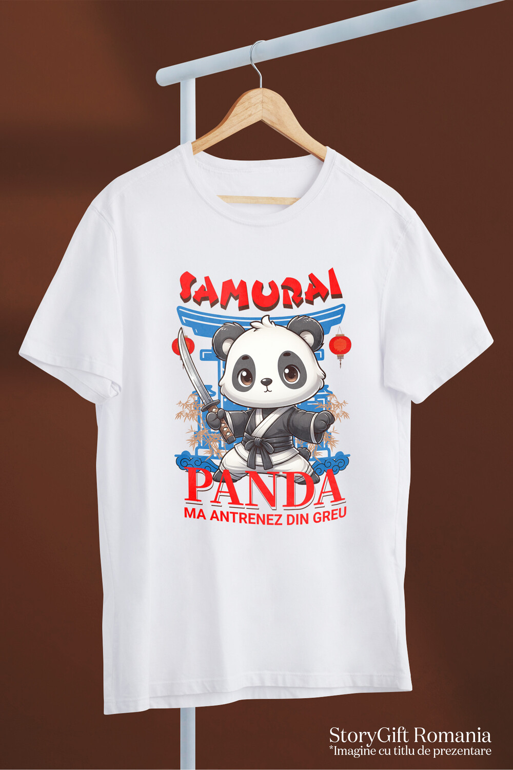 Tricou Barbati cu Urs Panda Samurai Cu Costum De Karate Si sabiee Ninaj Animal cu imprimeu pe Fata, 100% Bumbac, Alb, S
