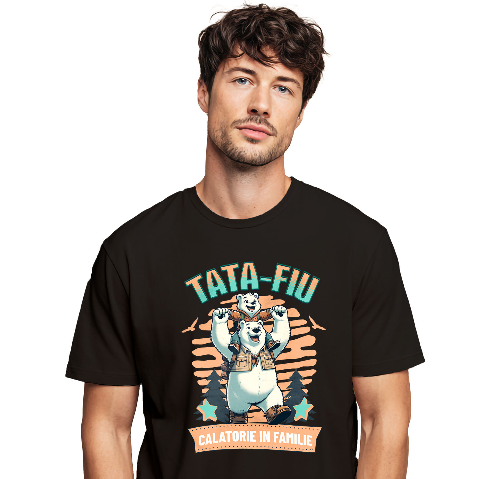 Tricou Barbati cu Urs Polar Aventura Tata Si Fiu Veselie Calatorie In Familie Dragoste Munte Padure cu imprimeu pe Fata, 100% Bumbac, Negru, L