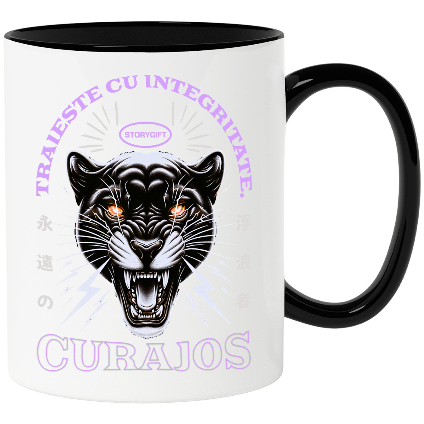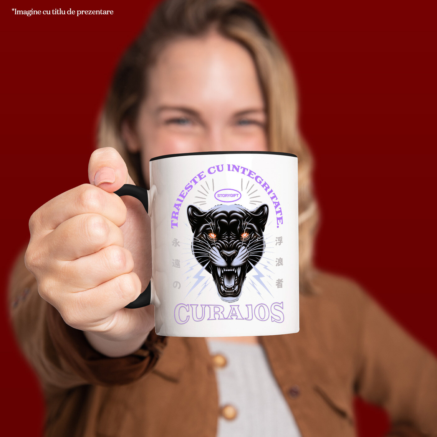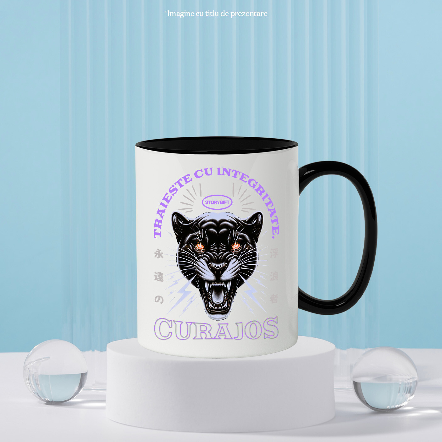 Cana Personalizata cu Felina Furioasa Ghepard Cu Ochii Curajos Motivational Copii, Ceramica, 330ML, cu Maner Negru