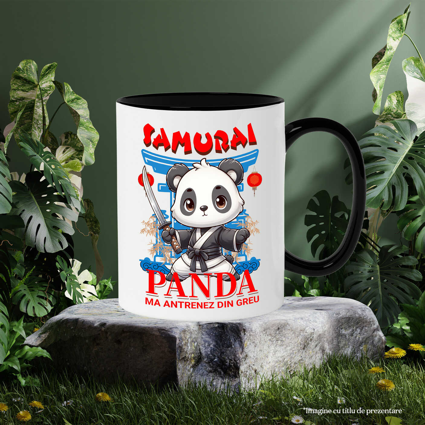 Cana Personalizata cu Urs Panda Samurai Cu Costum De Karate Si sabiee Ninaj Animal, Ceramica, 330ML, cu Maner Negru
