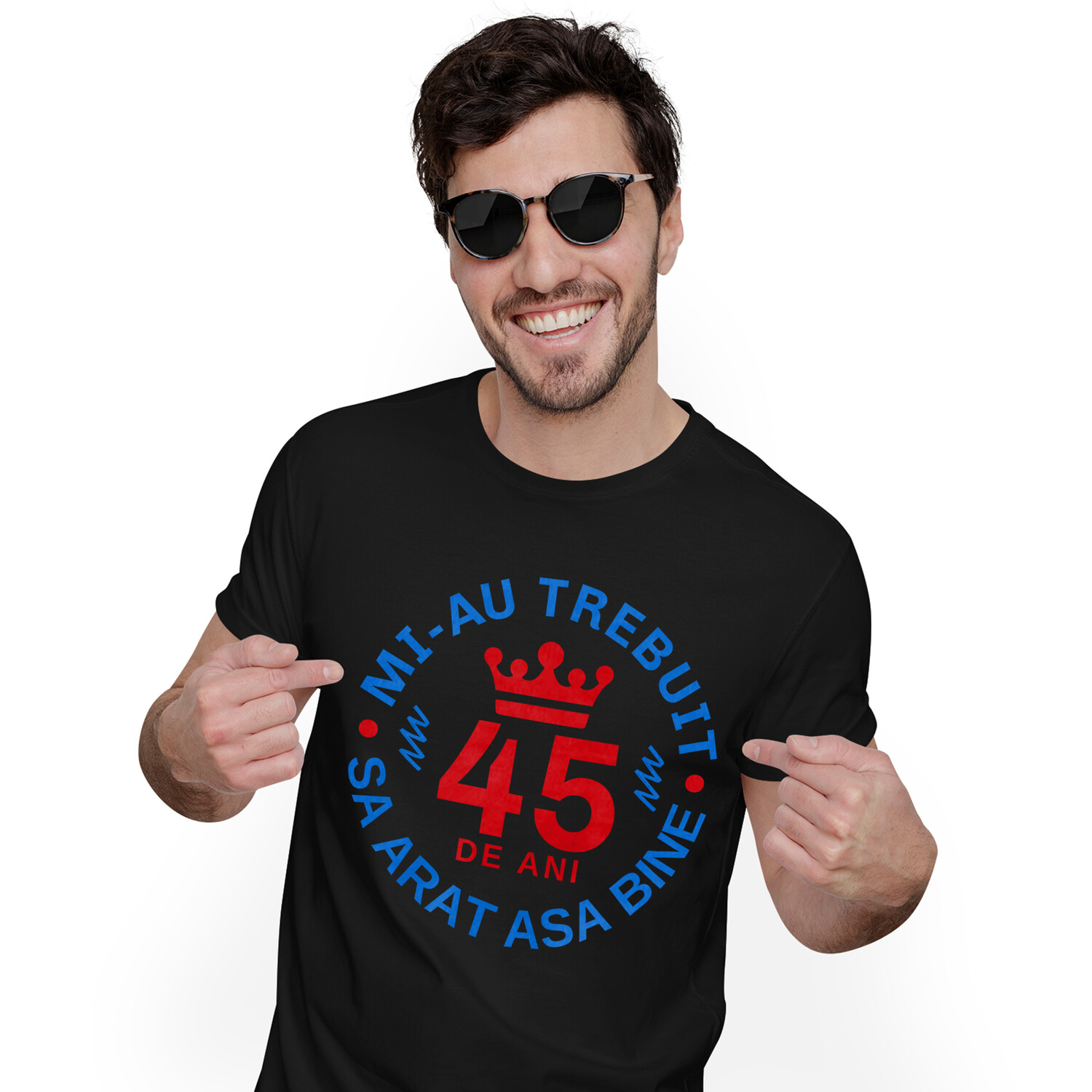 Tricou Barbati cu Design Circular Coroana Regala Text In Limba Roamana Varsta Aniversare cu imprimeu pe Fata, 100% Bumbac, Negru, L