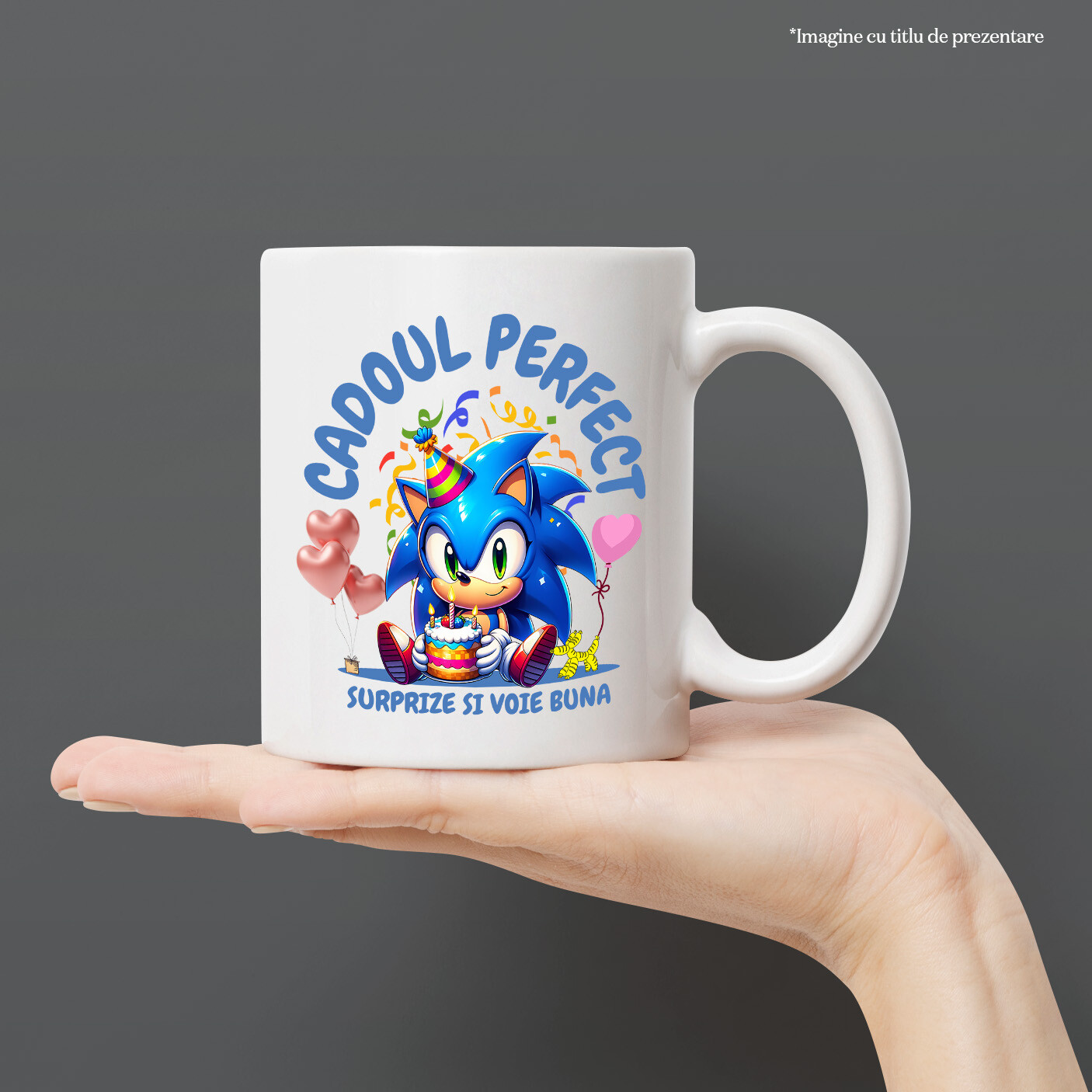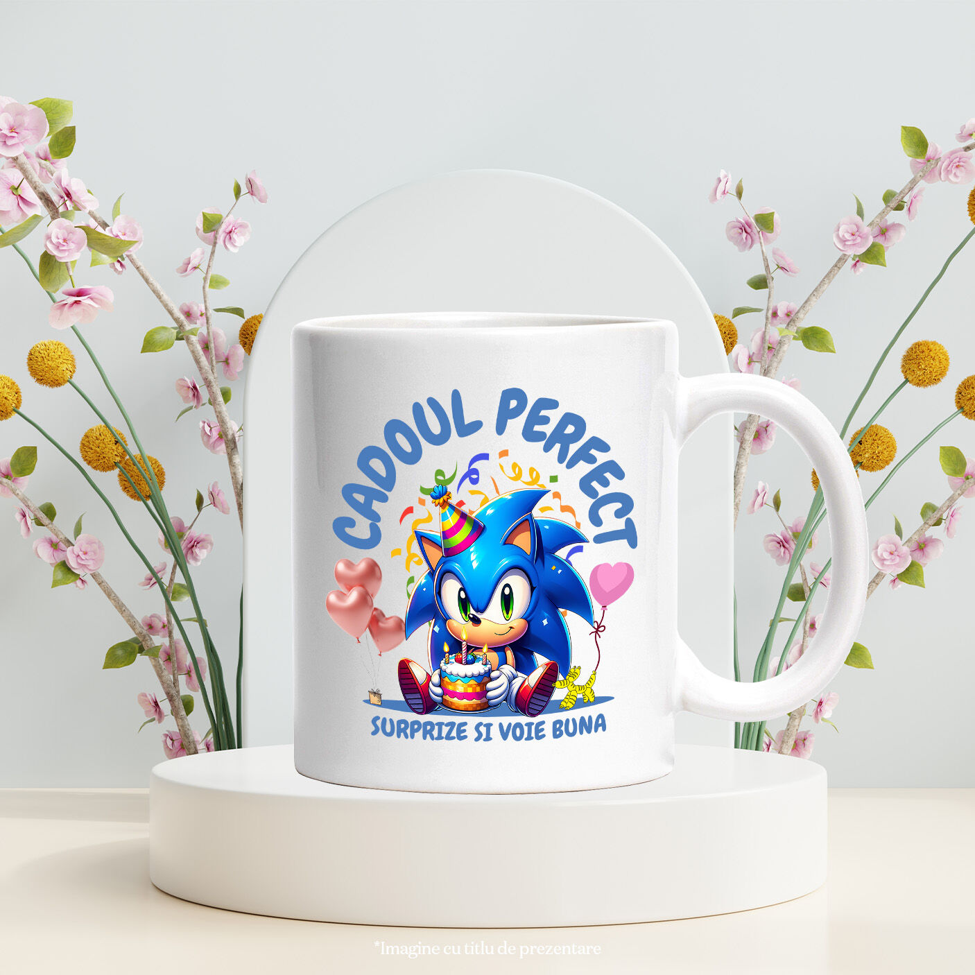 Cana Cu Sonic – Bucurie, Tort si Cadou Special Ceramica, 330ML, cu Maner Alb