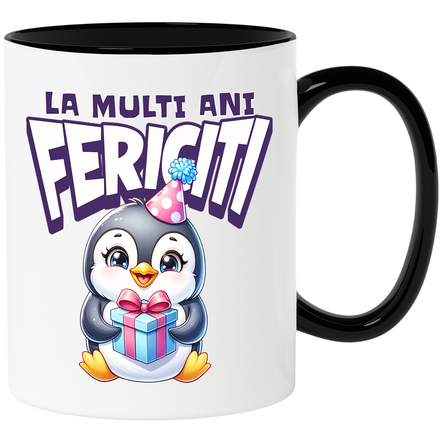 Cana Personalizata cu Pinguin Vesel Cu Coif Roz Aniversar Si Cadou Cu Funda Roz, Ceramica, 330ML, cu Maner Negru