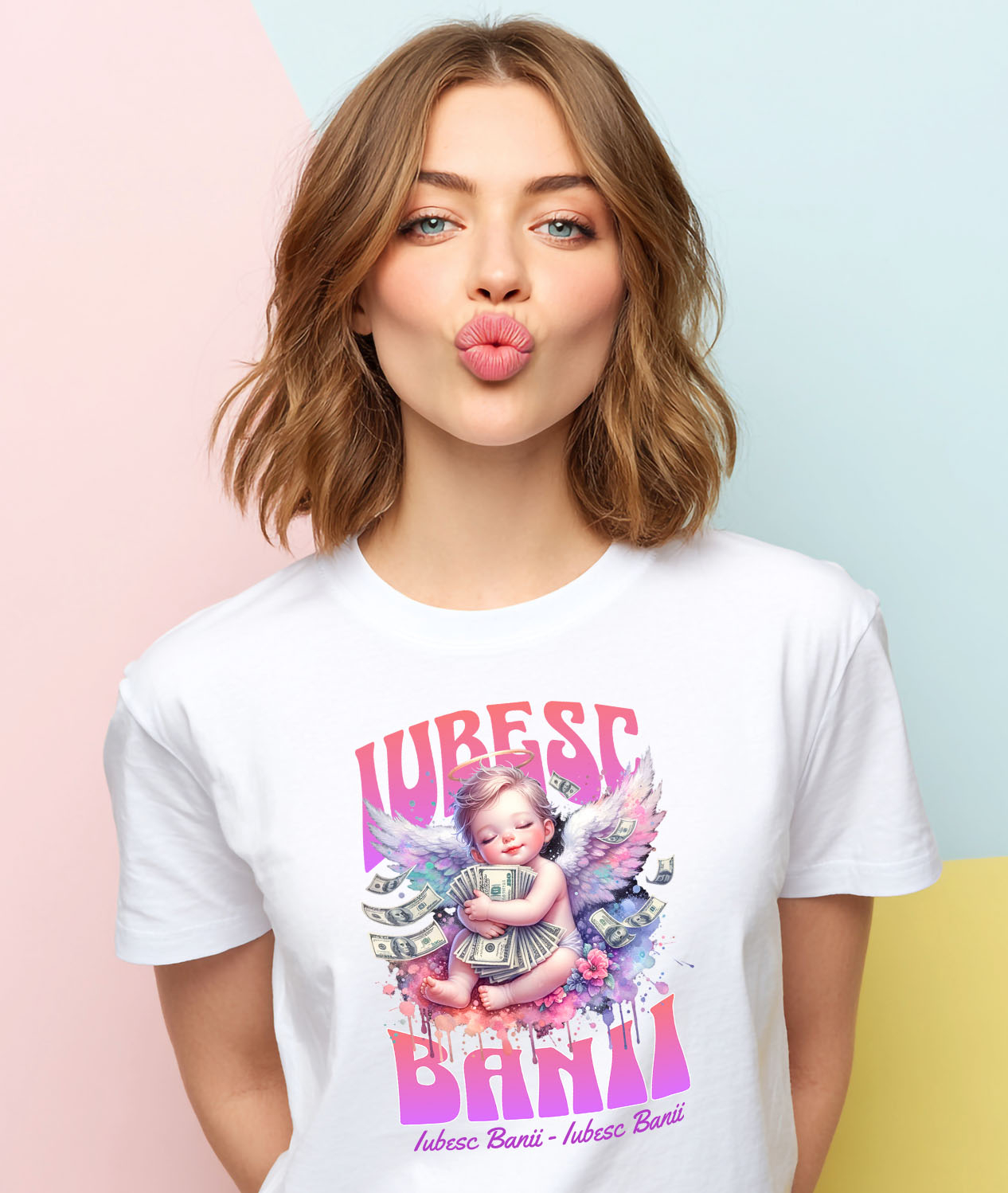 Tricou Femei cu Bebelus Inger Pe Nor Roz Imbratisand Bancnote bani, Avere Fericire, Avere, Milionar cu imprimeu pe Fata, 100% Bumbac, Alb, S