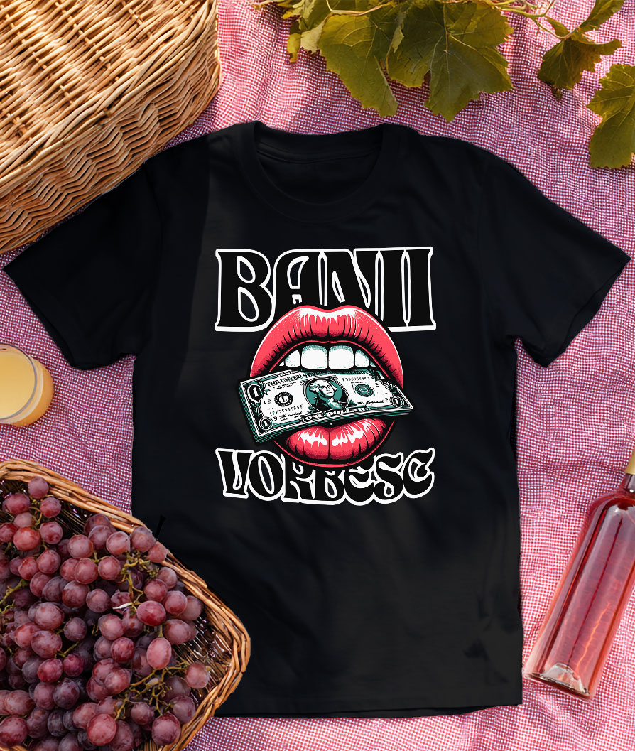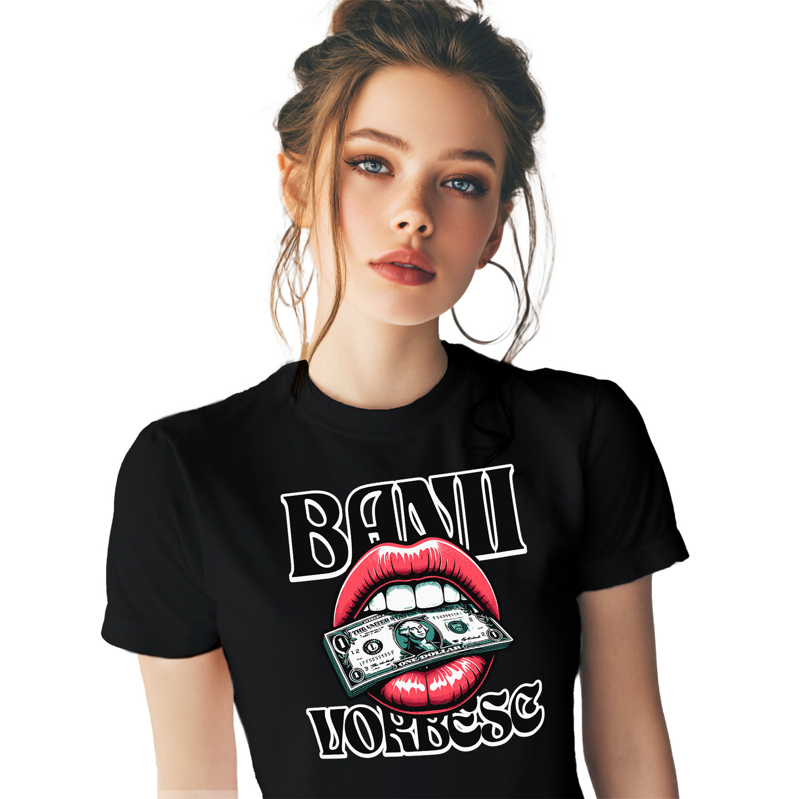 Tricou Femei cu Buze Rosii Femeie Cu Bancnota verde Bani Avere, Financiar, atragator cu imprimeu pe Fata, 100% Bumbac, Negru, XL