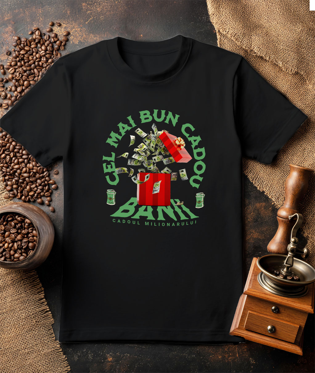 Tricou Barbati cu Cutie Rosie Cel Mai Bun Cadou Bani Bancnote In Zbor, Avere, Zi De Nastere cu imprimeu pe Fata, 100% Bumbac, Negru, L