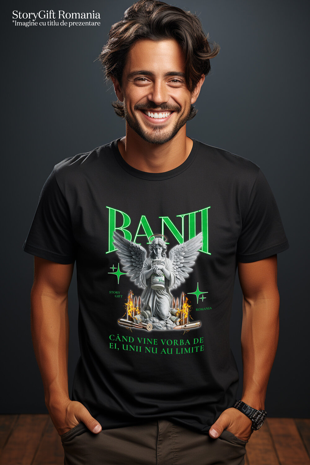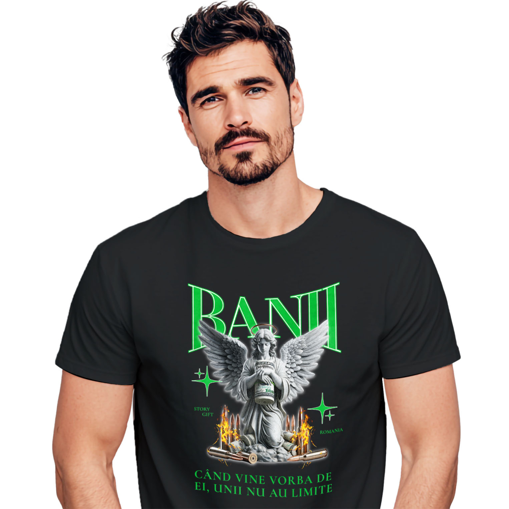 Tricou Barbati cu Inger Statuie De Piatra Gloante De Foc Bancnote Bani, Avere Financiar cu imprimeu pe Fata, 100% Bumbac, Negru, L
