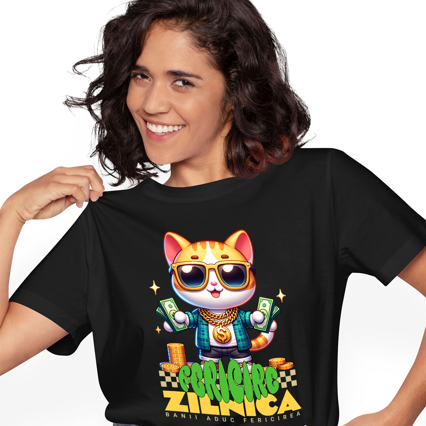 Tricou Femei cu Pisica Stil Gangster Cu Bancnote Bani si Bijuteri de Aur, Monede, Avere, Milionar. cu imprimeu pe Fata, 100% Bumbac, Negru, S