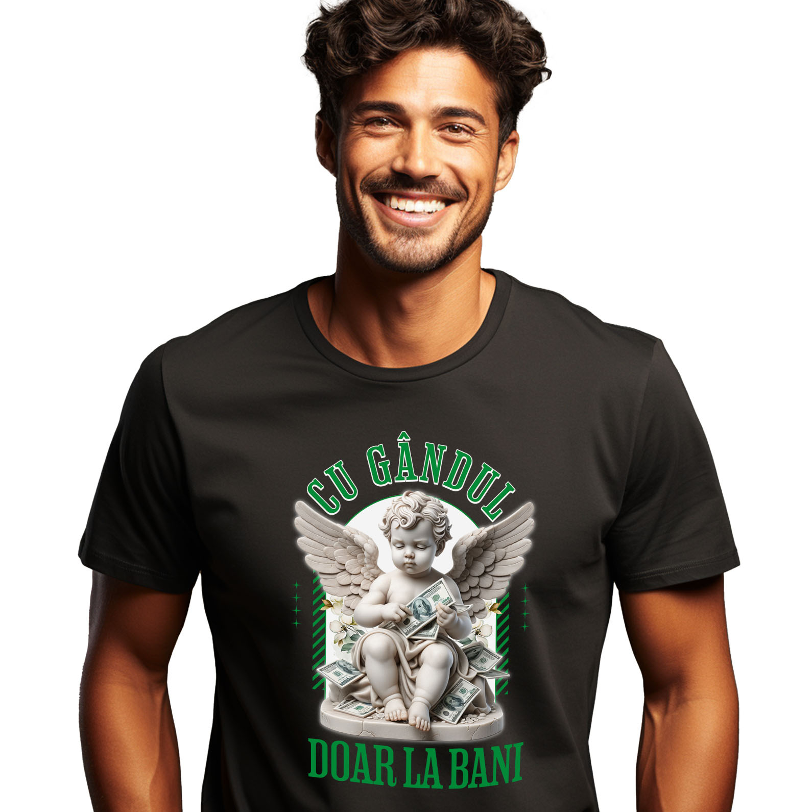 Tricou Barbati cu Statuie stil Grecesc Copil Inger Bancnote Bani, Avere, Milionar, Copii cu imprimeu pe Fata, 100% Bumbac, Negru, L