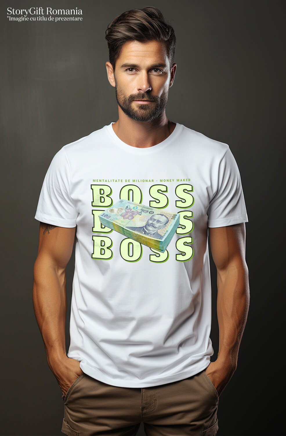 Tricou Barbati cu Teanc de Bancnote 100 lei, Avere Investiti, Milionar, Financiar cu imprimeu pe Fata, 100% Bumbac, Alb, S