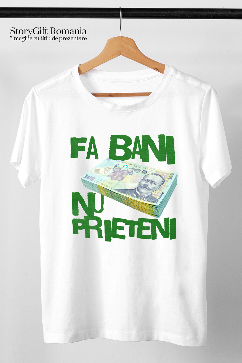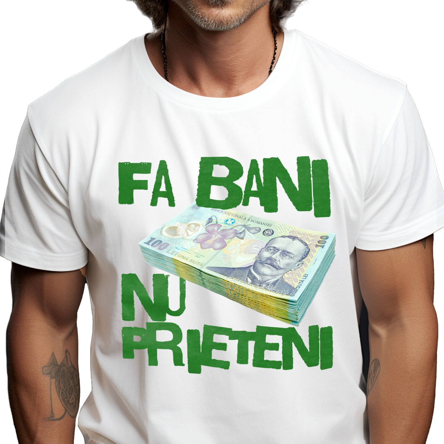 Tricou Barbati cu Teanc De Bani Bancnote 100 lei, Investitii Online, Milionar, Avere cu imprimeu pe Fata, 100% Bumbac, Alb, M