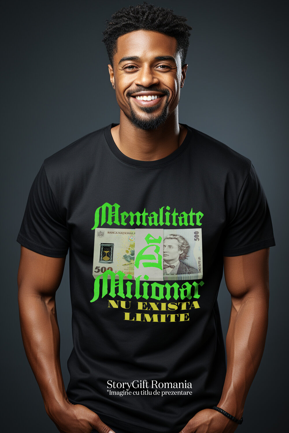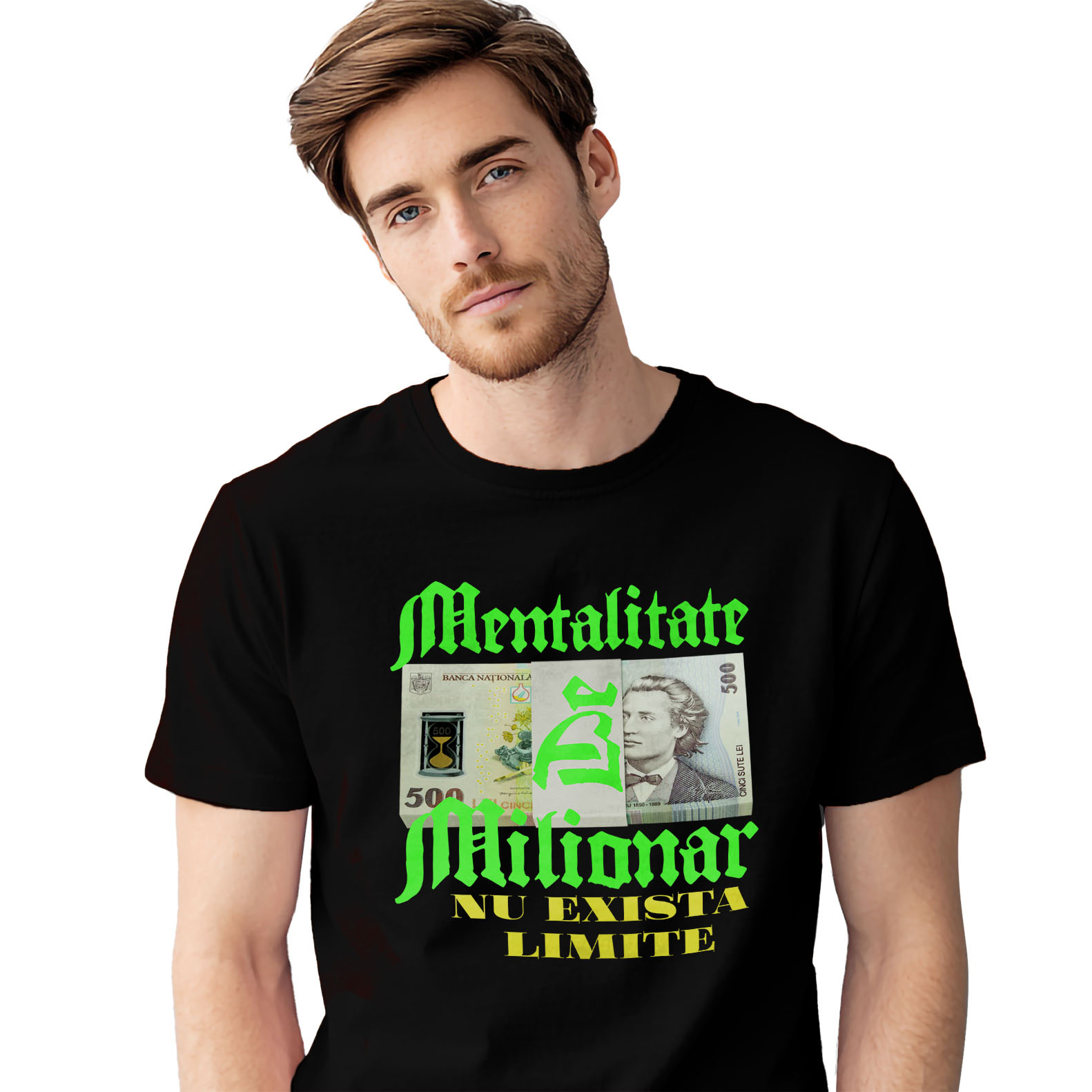 Tricou Barbati cu Teanc de Bani cu Elastic Bancnote 500 lei, Avere, Milionar, Investitii cu imprimeu pe Fata, 100% Bumbac, Negru, L