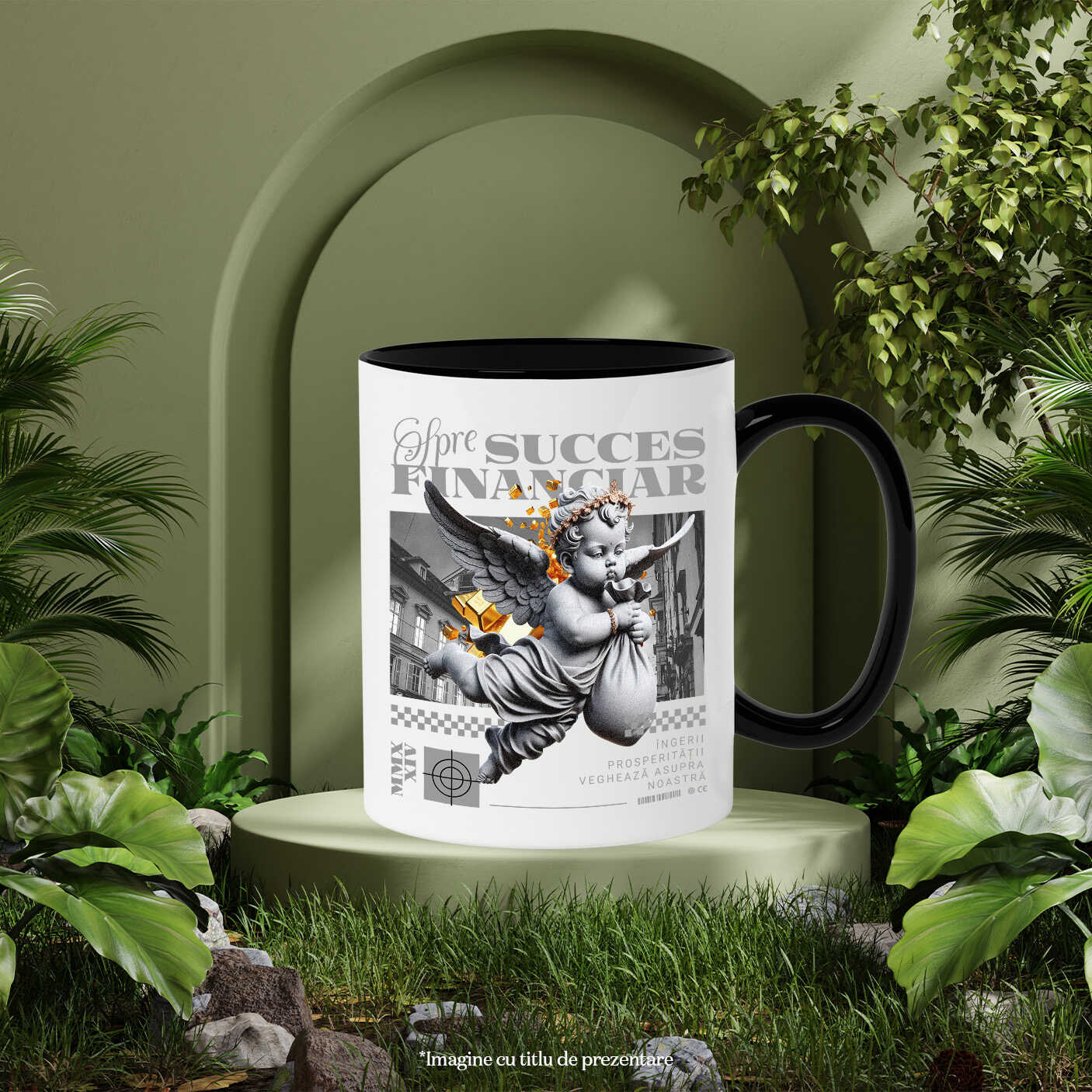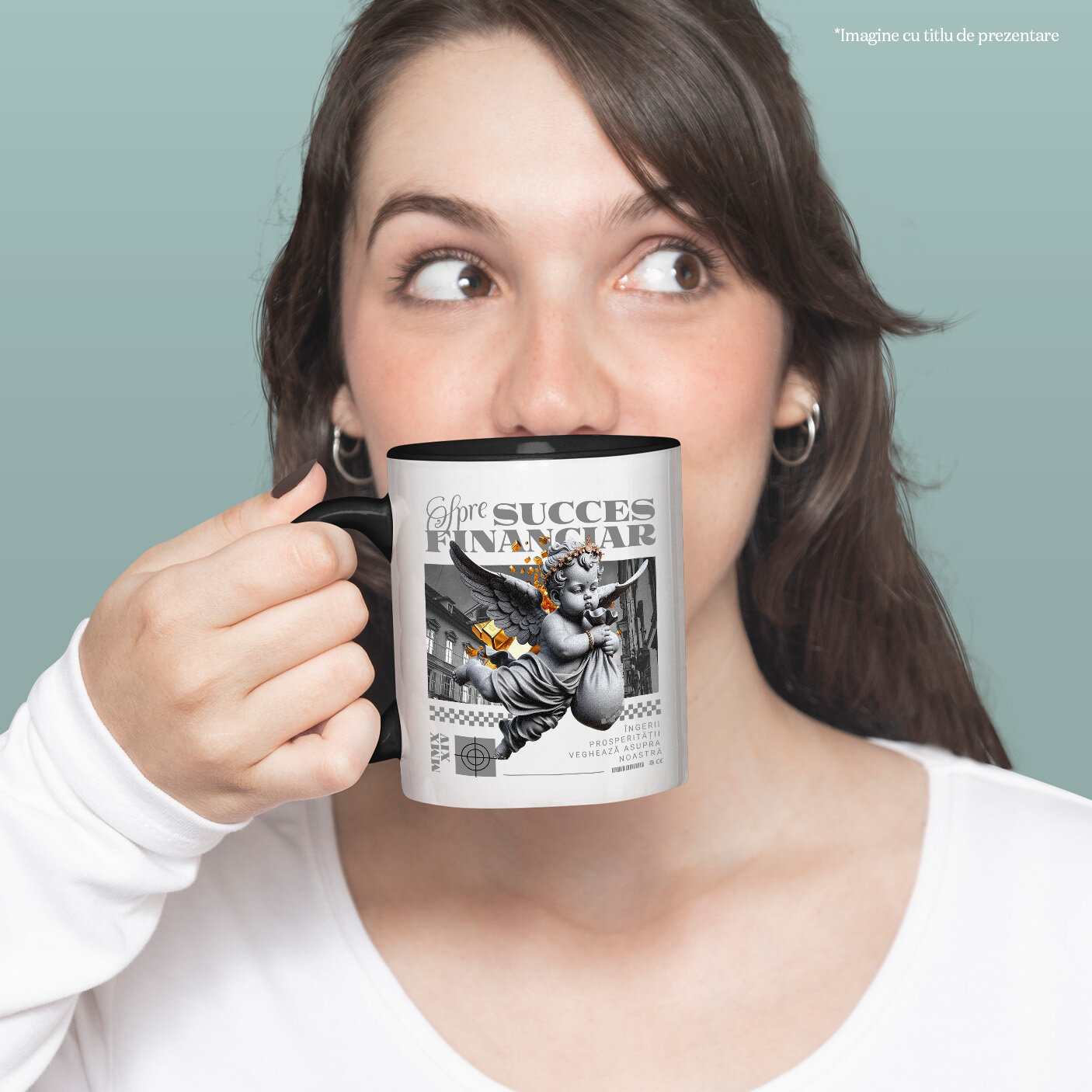 Cana Personalizata cu Inger Zburand cu Sac de bani Aur Galben, statuie Stil Grecesc, Arta Alb Negru, Ceramica, 330ML, cu Maner Negru