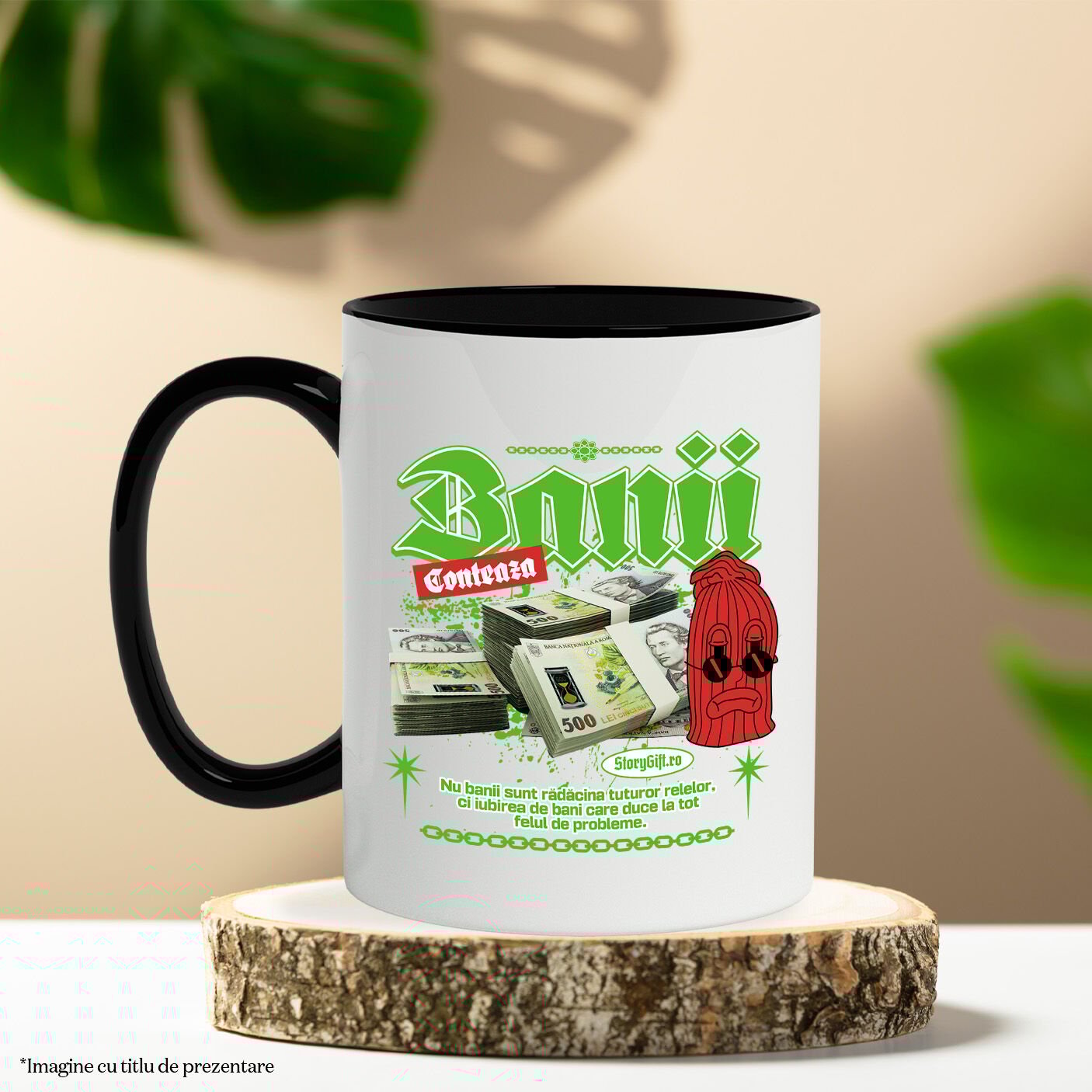 Cana Personalizata cu Teancuri Bancnote 500 Lei, Cagula Rosie Suparata, Investiri Financiar, Ceramica, 330ML, cu Maner Negru