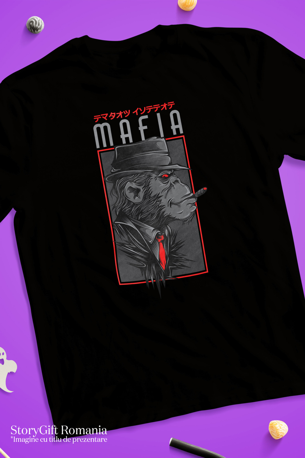 Tricou Barbati Cu Portret Gorila Cu Palarie, Tinuta Eleganta Cu Cravata Rosie, Text In Engleza Mafia, Text In Chineza, Iubitorii De Filme Sf, cu imprimeu pe Fata, 100% Bumbac, Negru, L