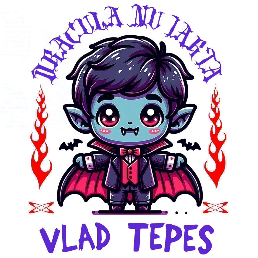 Sticker Personalizat cu Animatie Copii Vampir Vlad Tepes Hallowen Colti, Lilieci, Filme Horror, Dracula cu Margini Albe, PVC Vinyl 10 cm