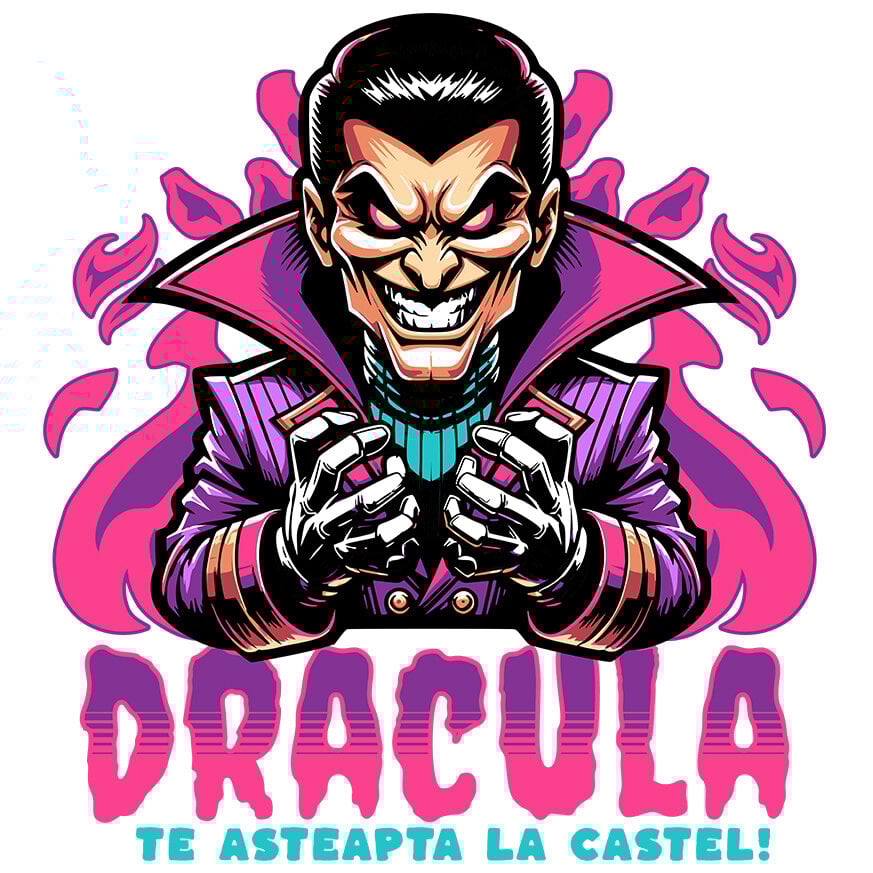 Sticker Personalizat cu Animatie infricosatoare Cu Barbat Stil Dracula Pelerina Mov Hallowen, Film, Vlad Tepes cu Margini Albe, PVC Vinyl 10 cm