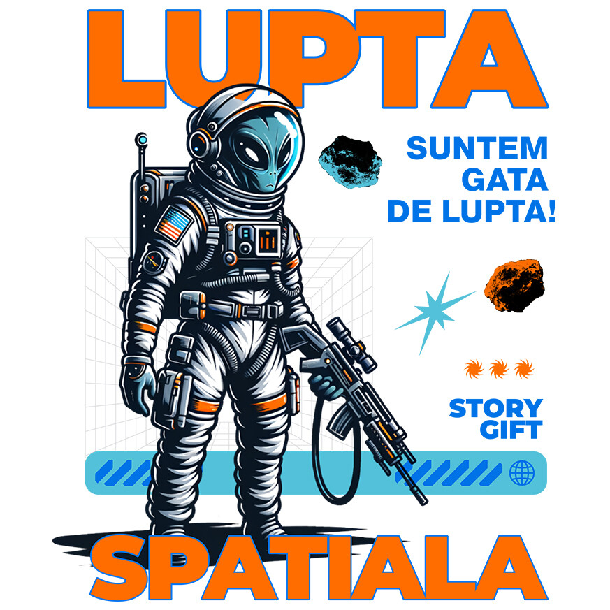 Sticker Personalizat cu Iubitorii De Spatiu Cosmic Portret Extraterestru cu Arma Si Costum Spatial, Razboi cu Margini Albe, PVC Vinyl 10 cm