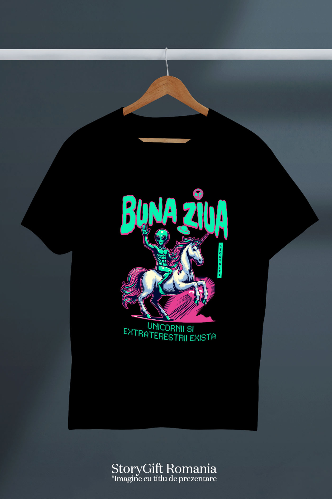 Tricou Copii cu Extraterestru Verde Corp Uman Calarind un Unicorn Roz Desene Animate Copii, Lume Digitala cu imprimeu pe Fata, 100% Bumbac, Negru, 8 Ani
