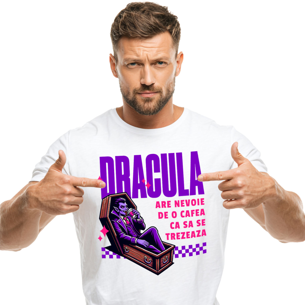Tricou Barbati cu Vampir in sicriu cu Pahar De Cafea Hallowen Dracula Vlat Tepes Din Transilvania, Film Horror cu imprimeu pe Fata, 100% Bumbac, Alb, S