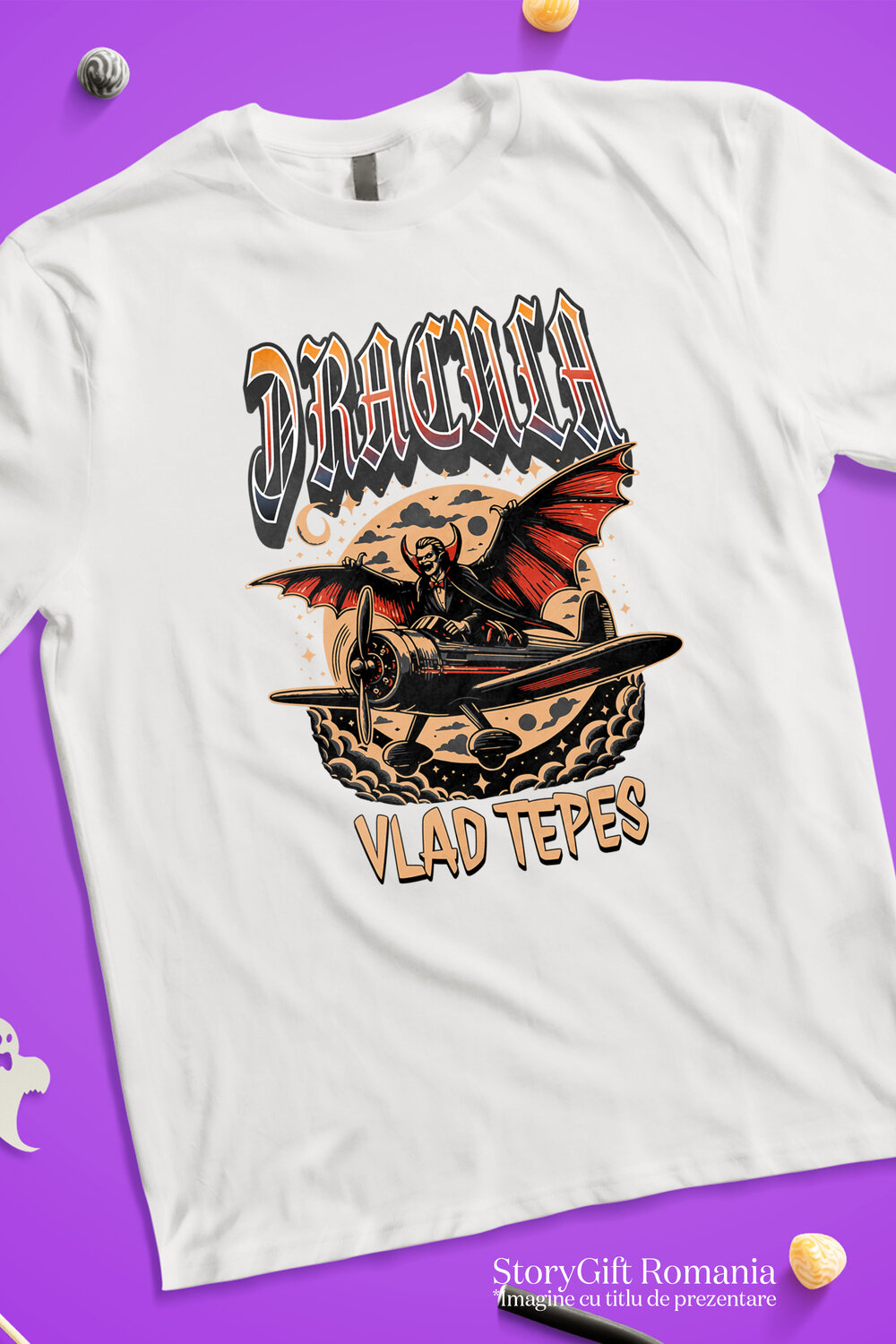 Tricou Barbati cu Vampir In Zbor Avion Luna Plina, Halowen, Text Vlad Tepes cu imprimeu pe Fata, 100% Bumbac, Alb, S