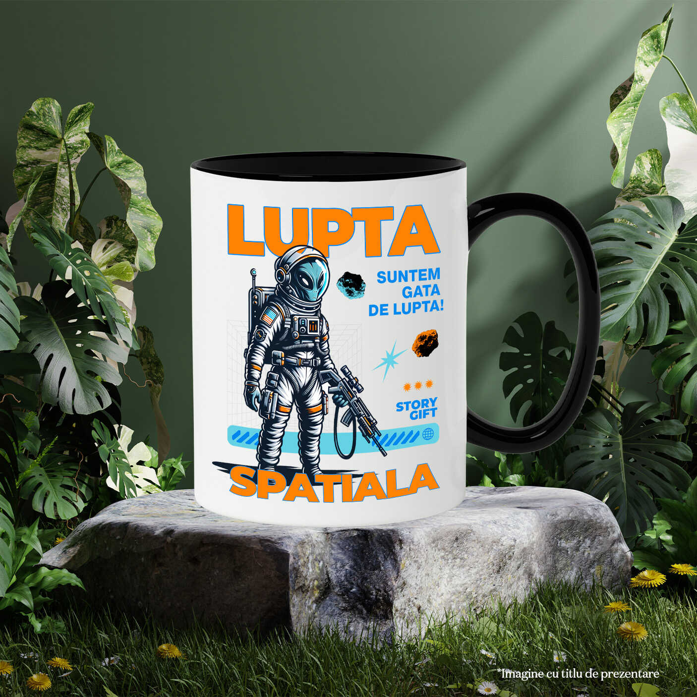 Cana Personalizata cu Iubitorii De Spatiu Cosmic Portret Extraterestru cu Arma Si Costum Spatial, Razboi, Ceramica, 330ML, cu Maner Negru