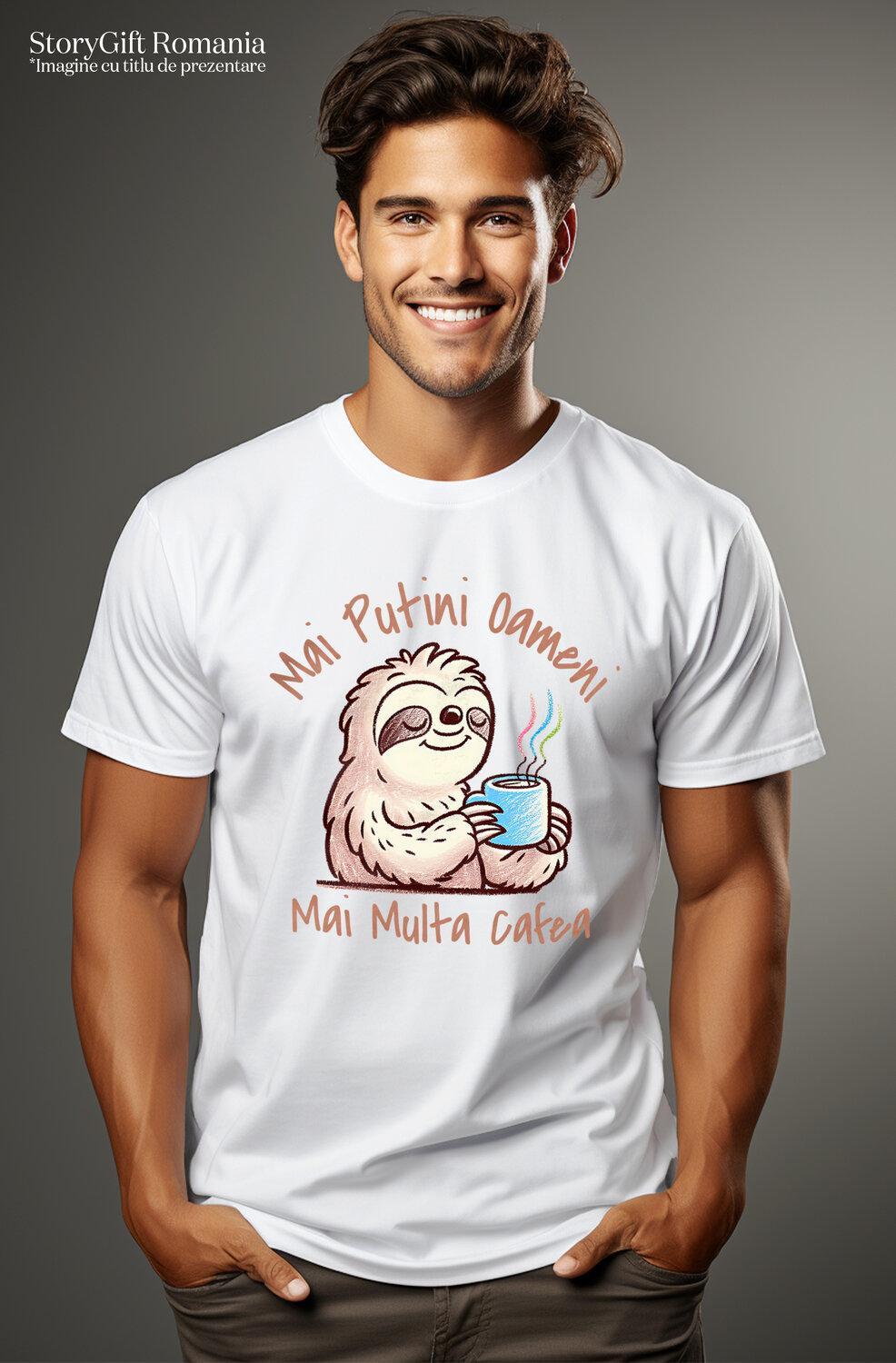 Tricou Barbati cu Animal lenes Somnoros Si haios Cu Cana Cafea Fierbinte Energie Dimineata cu imprimeu pe Fata, 100% Bumbac, Alb, M
