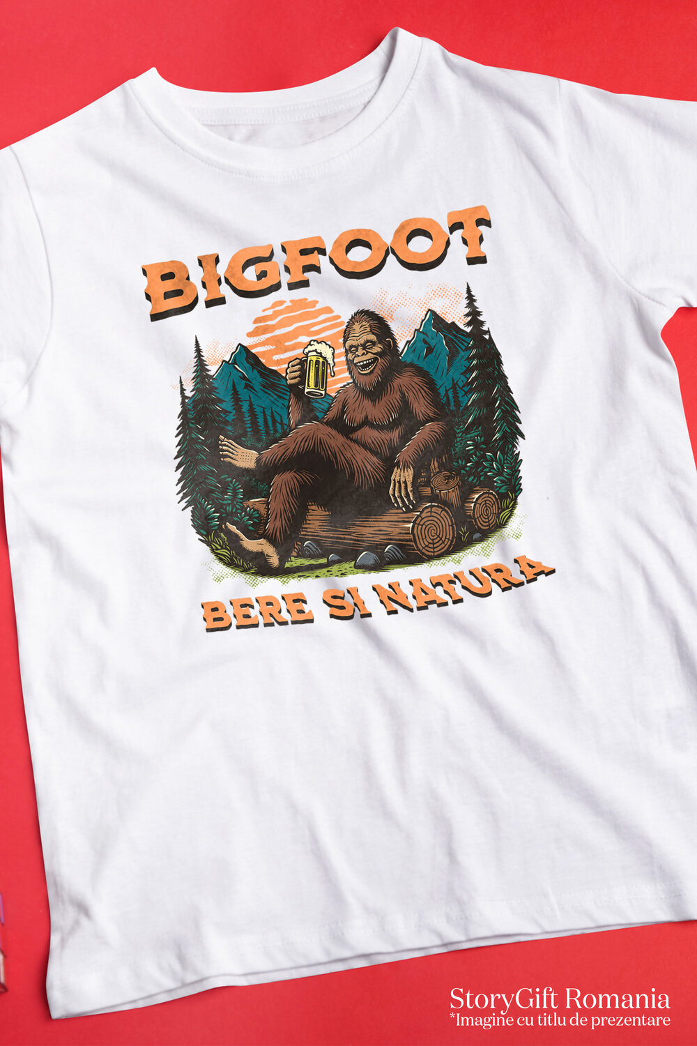 Tricou Barbati cu Animal Paros In Padure Relaxare Cu Bere Bigfoot In Natura, Munti Inalti Apus De Soare cu imprimeu pe Fata, 100% Bumbac, Alb, M