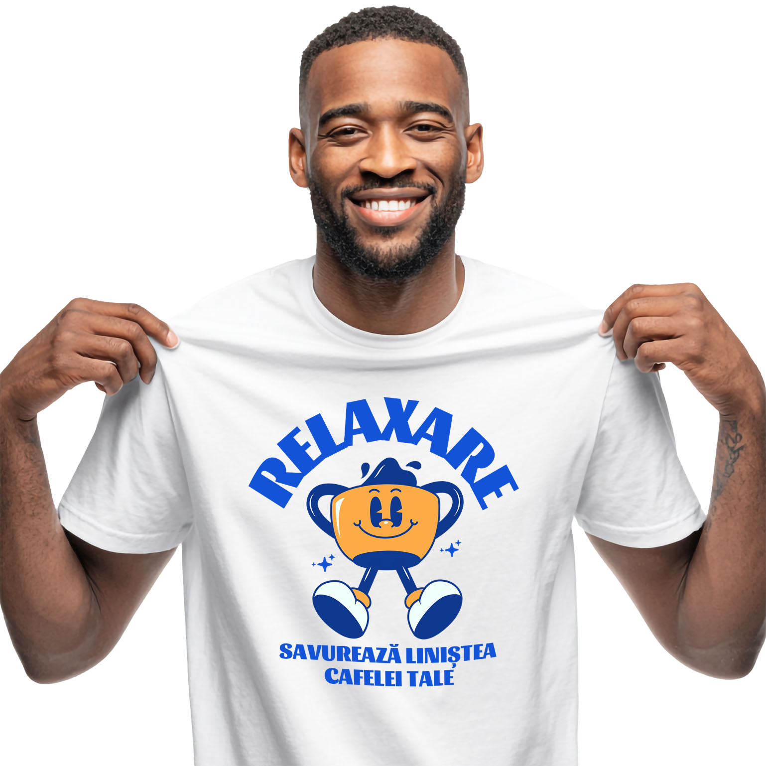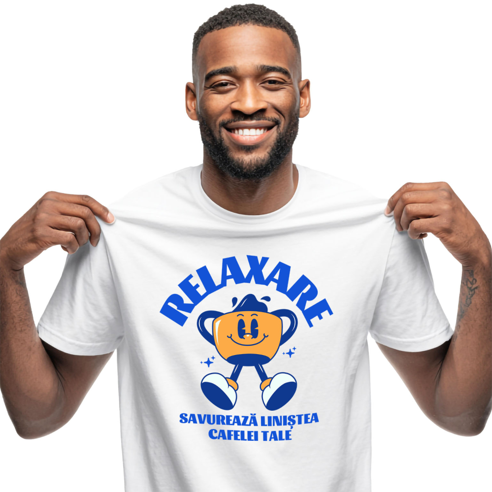 Tricou Barbati cu Cana De Cafea Vesela Relaxata, Savurare Aroma, Energia Dimineata cu imprimeu pe Fata, 100% Bumbac, Alb, M
