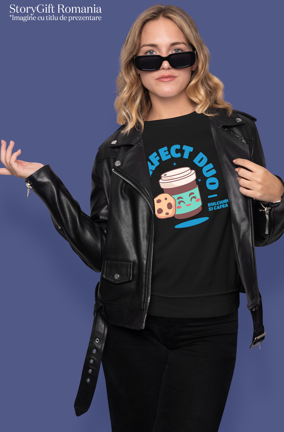 Tricou Femei cu Cuplu Perfect Pahar De Cafea Cu Prajitura, Dimineata Perfecta, Dulcuri Energie cu imprimeu pe Fata, 100% Bumbac, Negru, XL