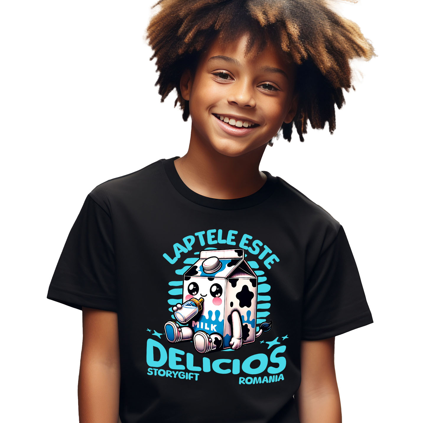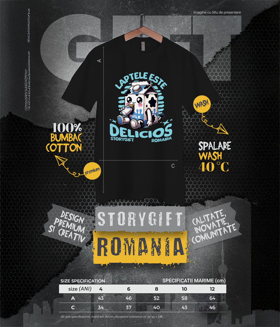 Tricou Copii cu Cutie Carton De lapte Bebe, Model De Vaca, Beberon Nou Nascut cu imprimeu pe Fata, 100% Bumbac, Negru, 8 Ani
