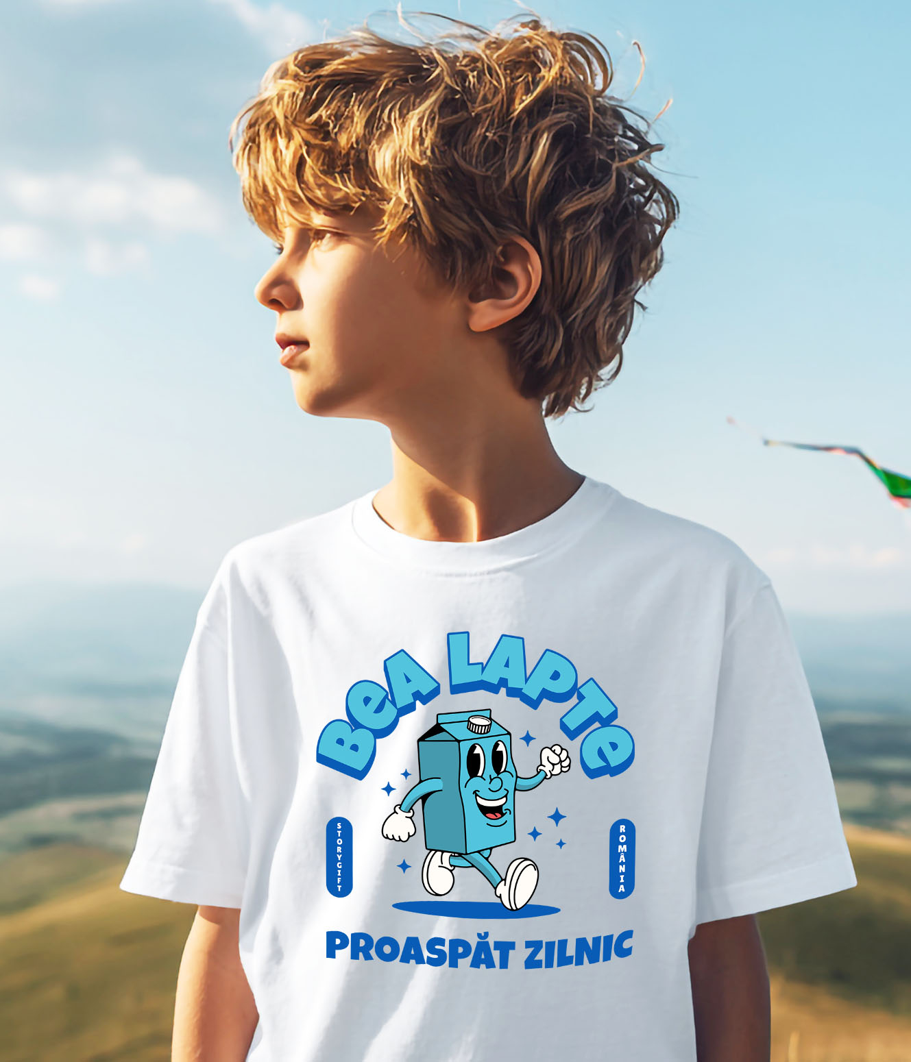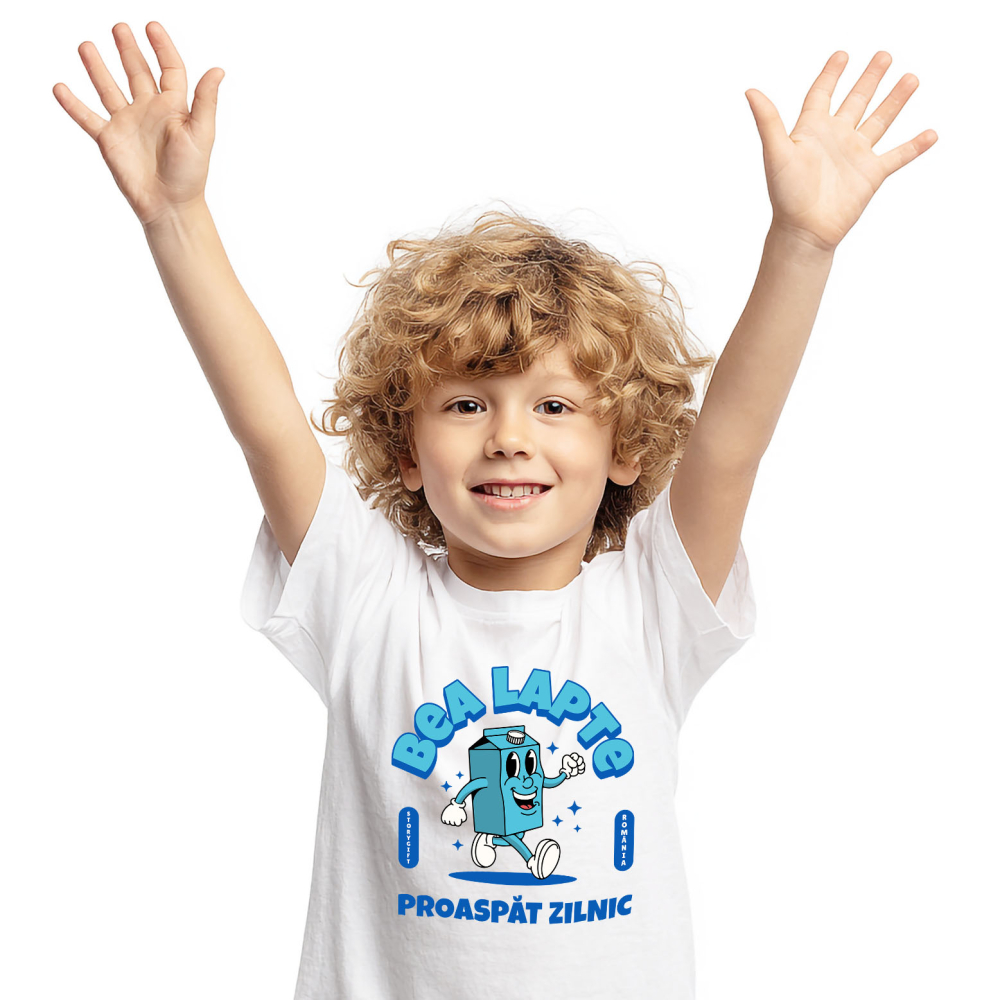 Tricou Copii cu Cutie Carton De Lapte Vesela Mergand, Animatie, Natura, Lactate, Vaca cu imprimeu pe Fata, 100% Bumbac, Alb, 10 Ani
