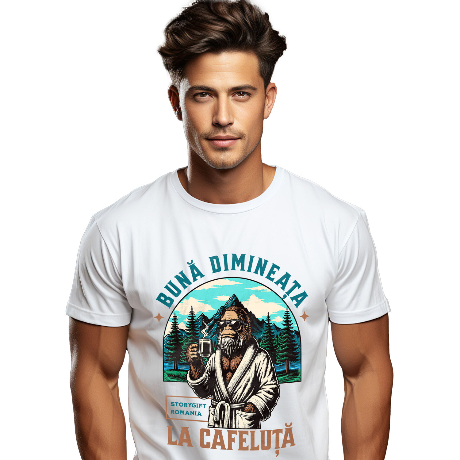 Tricou Barbati cu Gorila Animal Blanos Cu Cana De Cafea Calda In Natura Padure cu imprimeu pe Fata, 100% Bumbac, Alb, S