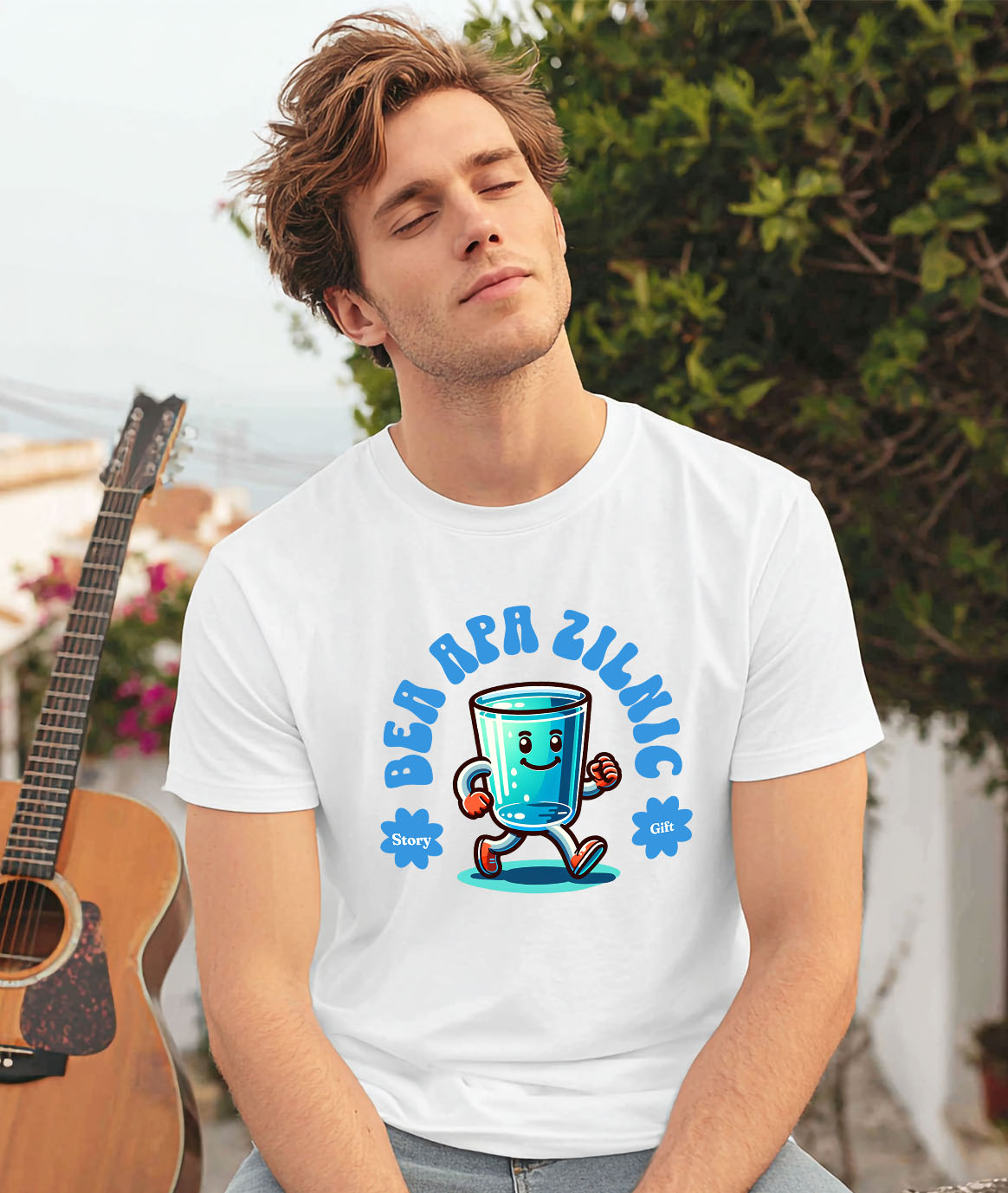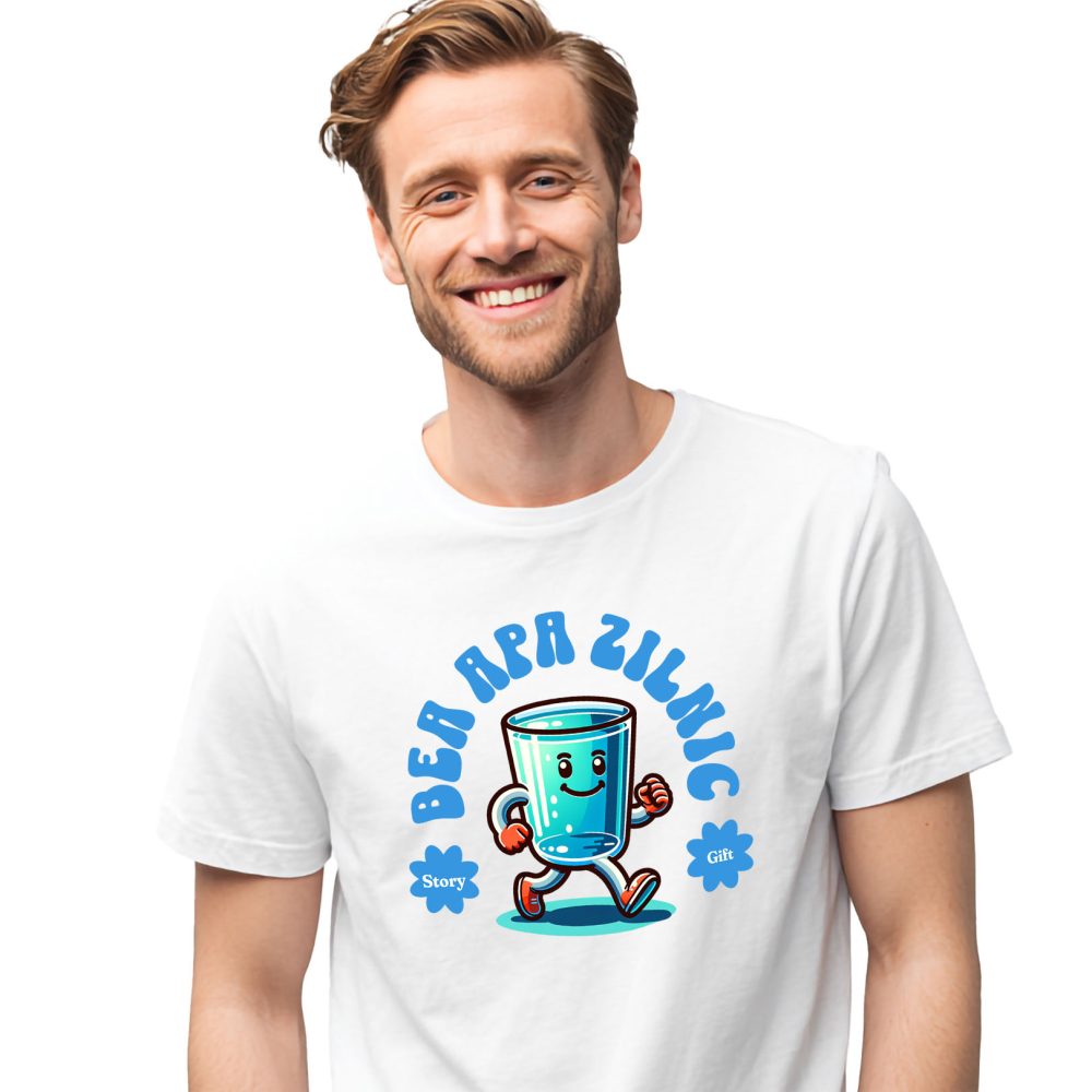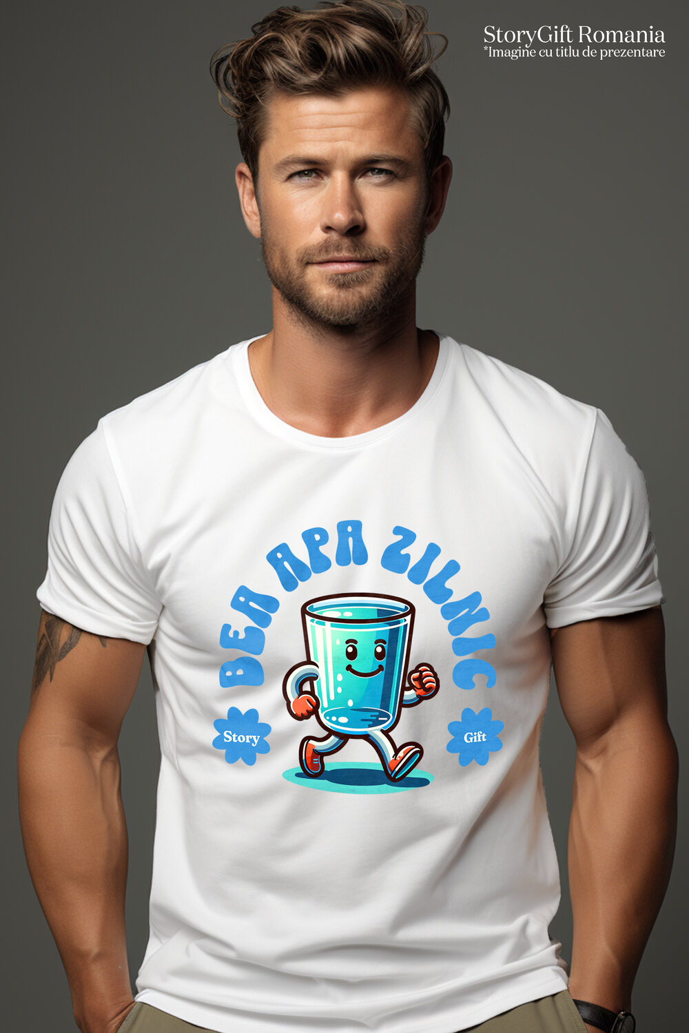 Tricou Barbati cu Pahar De apa In Mers Zambitor Gata De Aventura Hidratare, Apa Curata, Animatie cu imprimeu pe Fata, 100% Bumbac, Alb, M