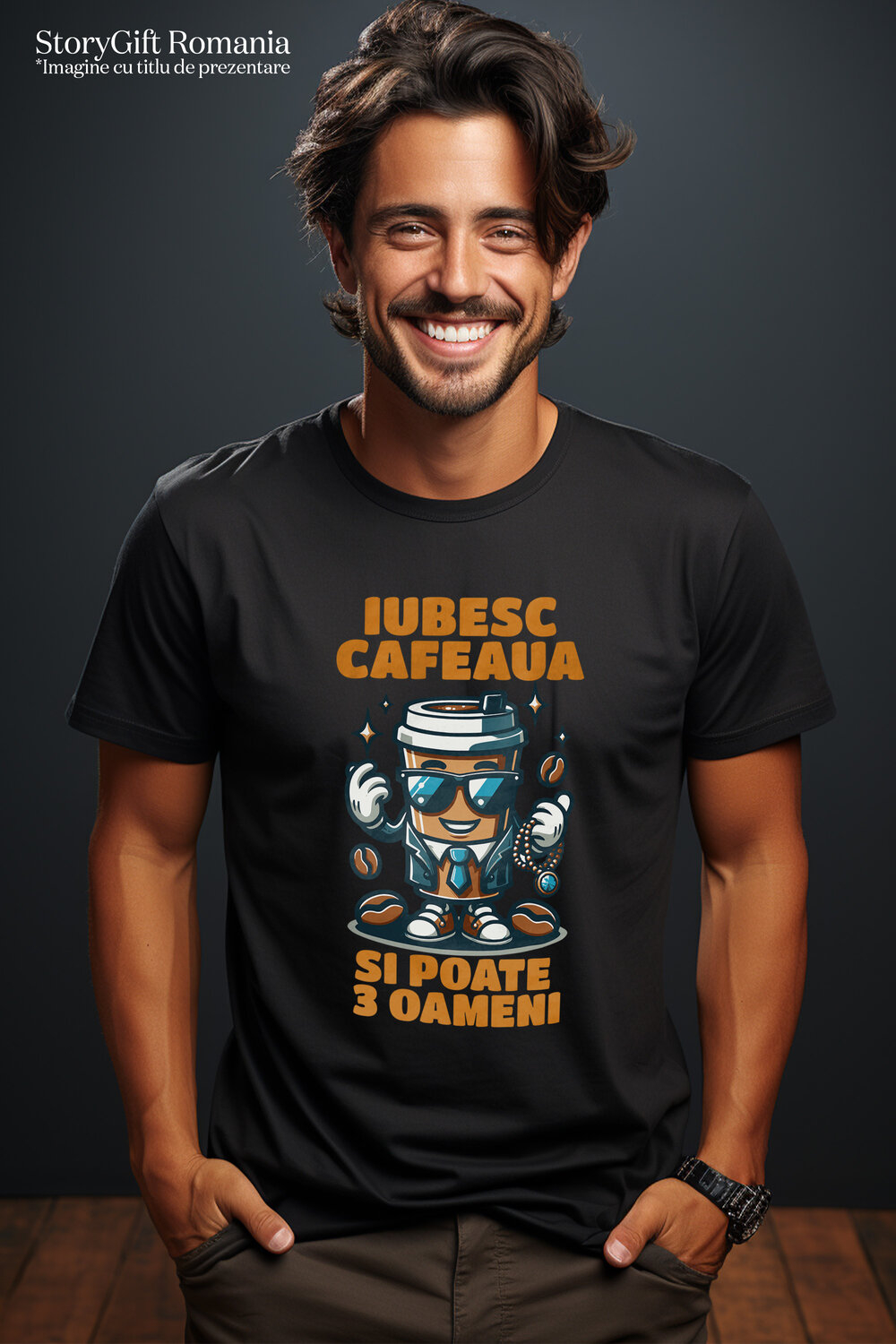 Tricou Barbati cu Pahar De Cafea Office Style Costum Cu Ochelarii De Soare, Dimineata Perfecta Energie cu imprimeu pe Fata, 100% Bumbac, Negru, L