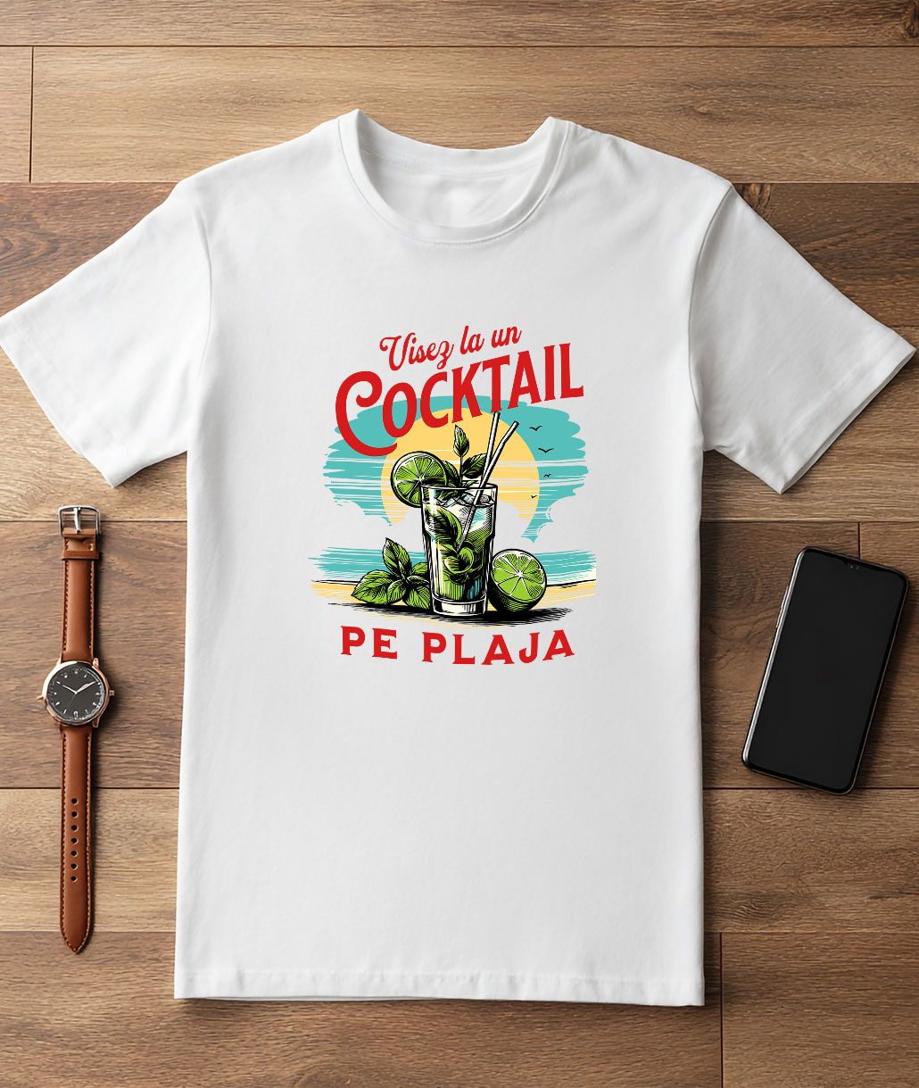 Tricou Barbati cu Pahar De Cocktail Pe Plaja Apus de Soare Relaxare Vacanta Menta, Bautura Racoritoare cu imprimeu pe Fata, 100% Bumbac, Alb, XS