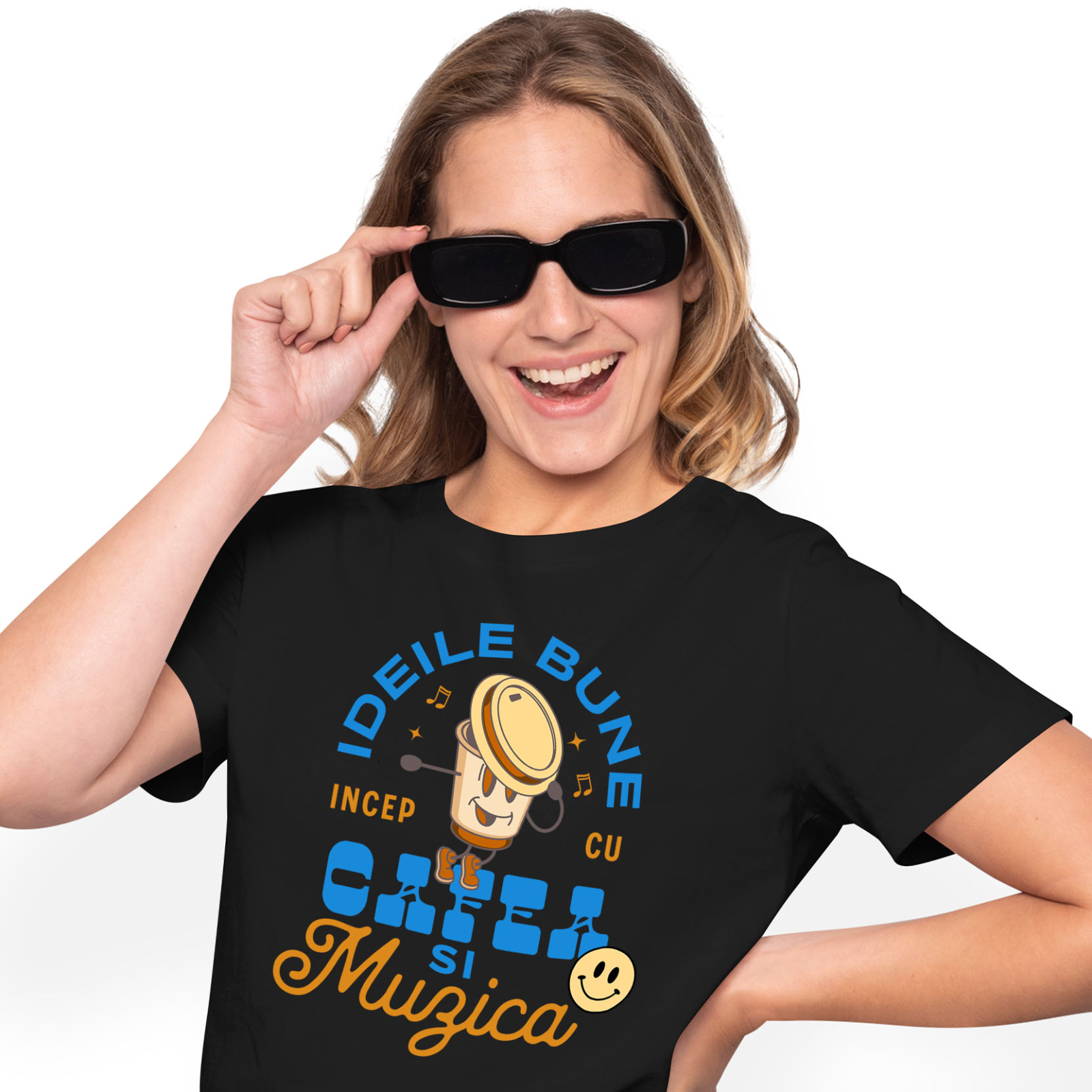Tricou Femei cu Pozitie de dans Pahar De cafea Vesel, Smiley Face, Energie Dimineata grea, Zi Perfecta cu imprimeu pe Fata, 100% Bumbac, Negru, M