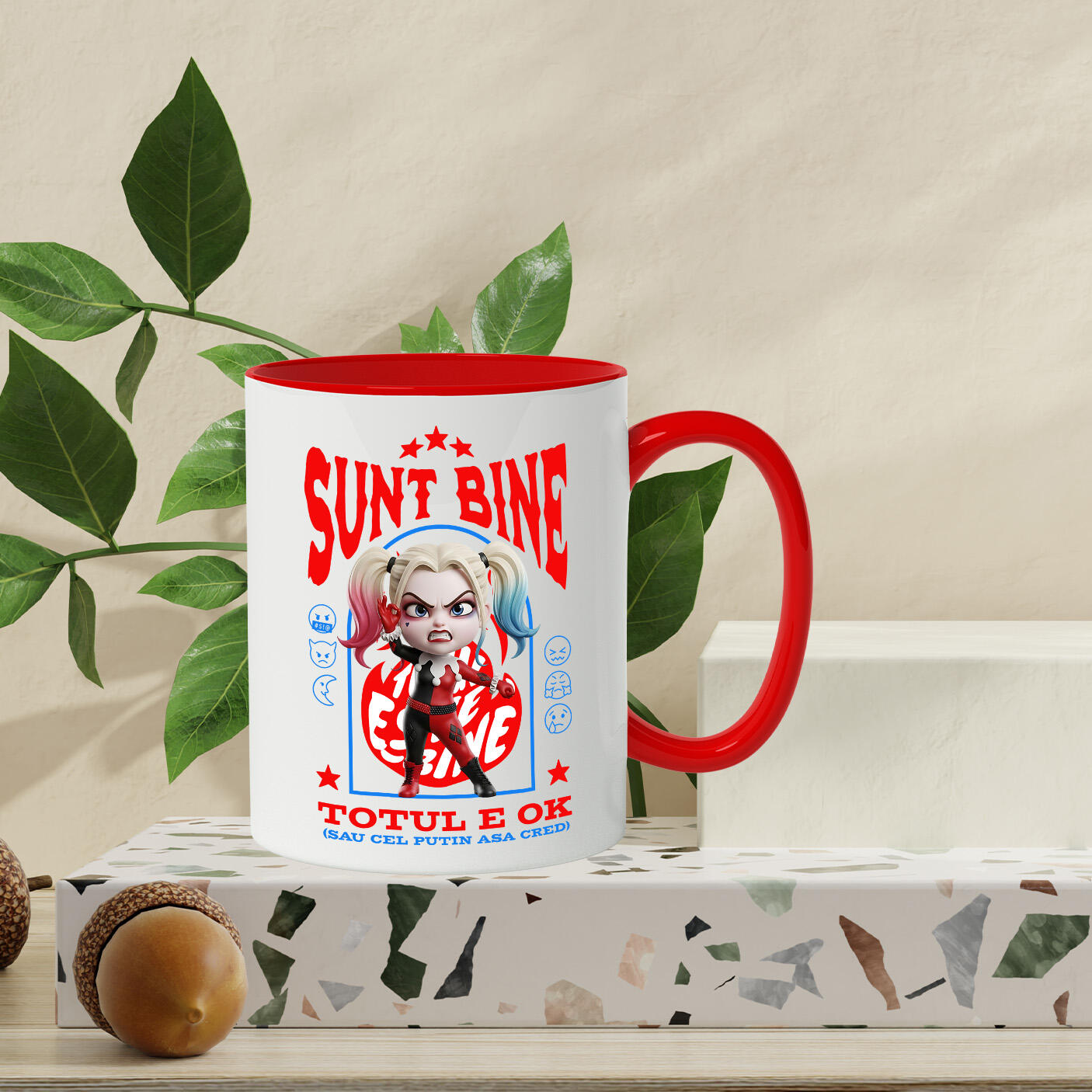 Cana Cu Harley Quenn, Ok, Sarcastic, Nervos, Iritat Ceramica, 330ML, cu Maner Rosu