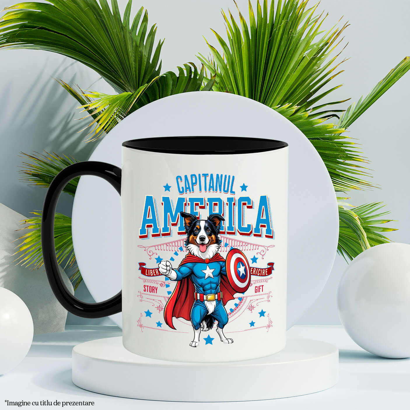 Cana Personalizata cu Border Collie Caine In Costum de Capitan America cu Pelerina, Erou Nocturn, Desene animate, Copii, Iubitorii de Animale, Ceramica, 330ML, cu Maner Negru